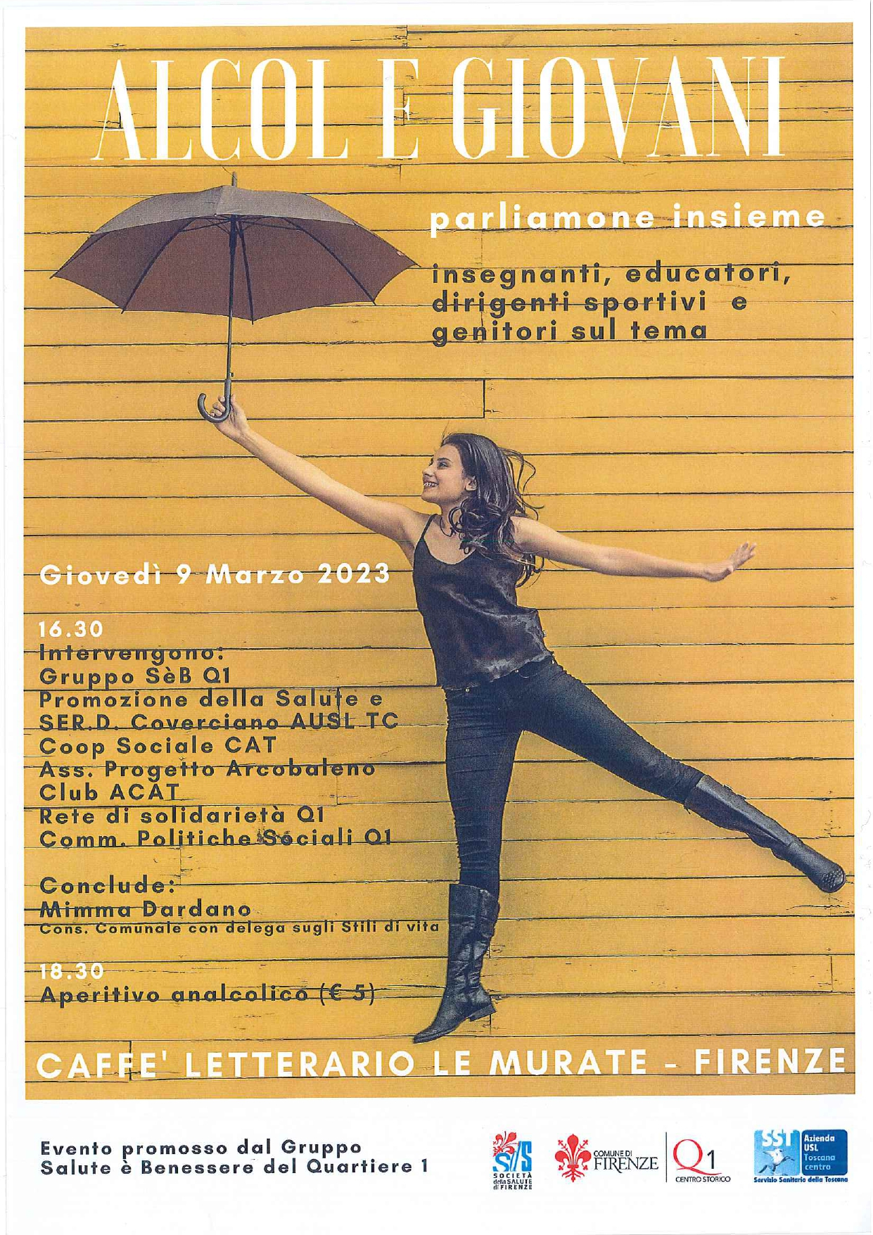 Intervengono Gruppo Salute è Benessere Q1, Promozione della Salute e SER.D. Coverciano AUSL TC, Coop Sociale CAT, Associazione Progetto Arcobaleno, Club ACAT, Rete di Solidarietà Q.1, Commissione Servizi Sociali Q. 1. Conclude Mimma Dardano, Consigliera Comunale con delega sugli Stili di vita. ore 18.30 aperitivo analcolico.