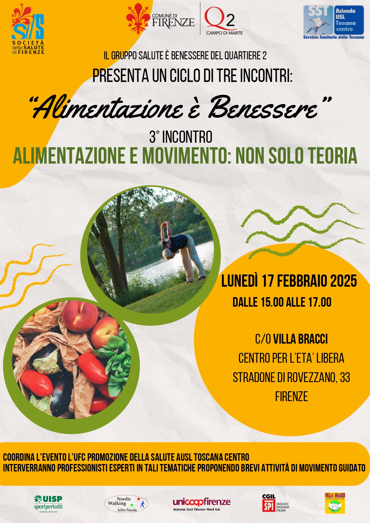 Terzo ed ultimo incontro del ciclo promosso dal gruppo Salute è Benessere del Quartiere 2 con il coordinamento dell'UFC Salute AUSL Toscana Centro, lunedì 17 Febbraio dalle ore 15.00 alle ore 17.00, presso il Centro per l'età Libera Villa Bracci; all'incontro, che avrà come tematica "Alimentazione e movimento: non solo teoria", interverranno professionisti esperti in tali tematiche proponendo brevi attività di movimento gratuito.