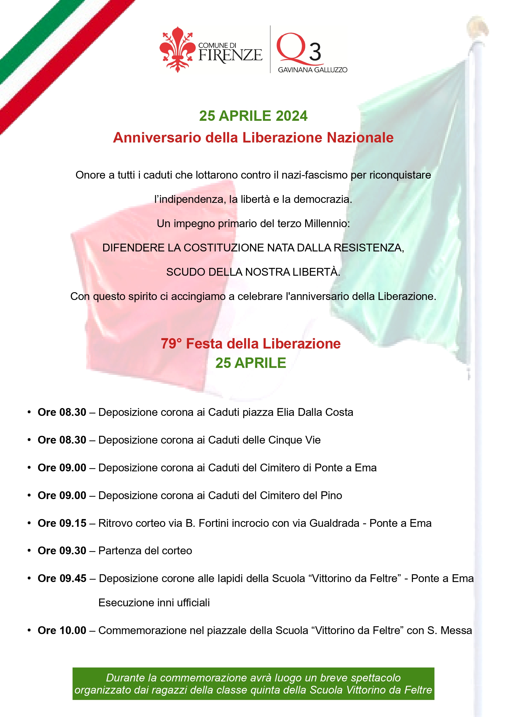 ● Ore 09.45 – Deposizione corone alle lapidi della Scuola “Vittorino da Feltre” - Ponte a Ema Esecuzione inni ufficiali