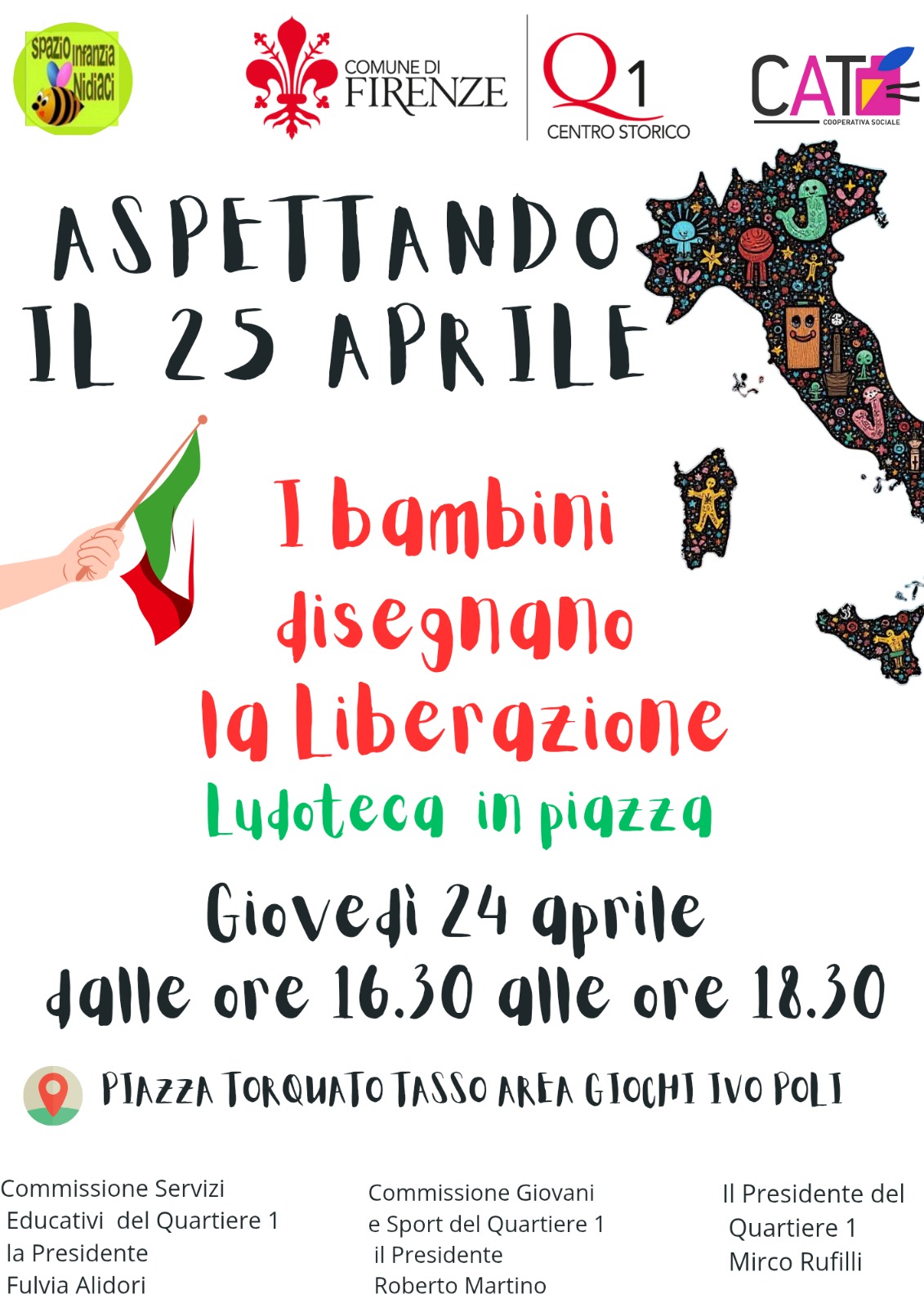 Il 25 aprile 1945 fu cosi, la nascita di un paese democratico e libero. I bambini disegneranno, in mezzo a fazzoletti colorati, il loro autoritratto. Il volto dell'Italia che festeggia il 25 aprile