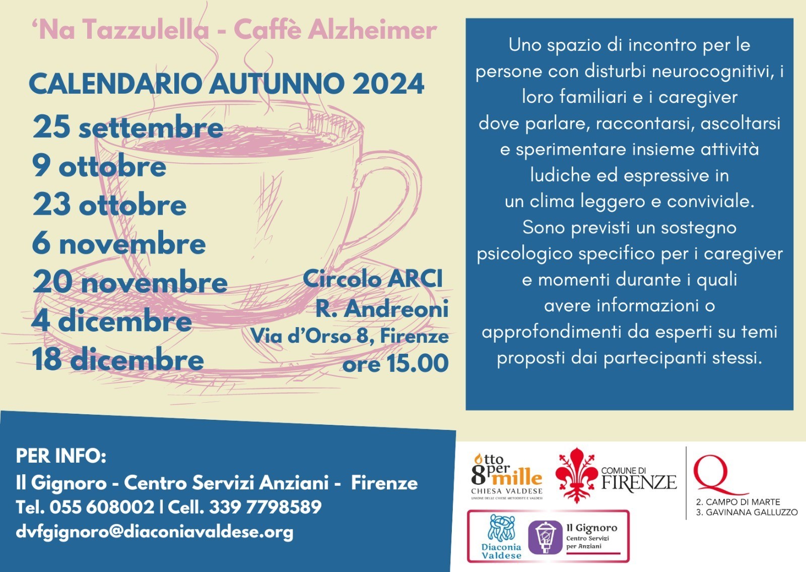 Riparte anche per l'autunno 2024 il "Caffè Alzheimer ‘Na Tazzulella", organizzato dal centro servizi per anziani CSD “Il Gignoro” in collaborazione con i Quartieri 2 e 3 del Comune di Firenze, con lo scopo di creare uno spazio di incontro per le persone con disturbi neurocognitivi, i loro familiari ed i loro caregiver dove poter parlare, raccontarsi ed ascoltarsi.