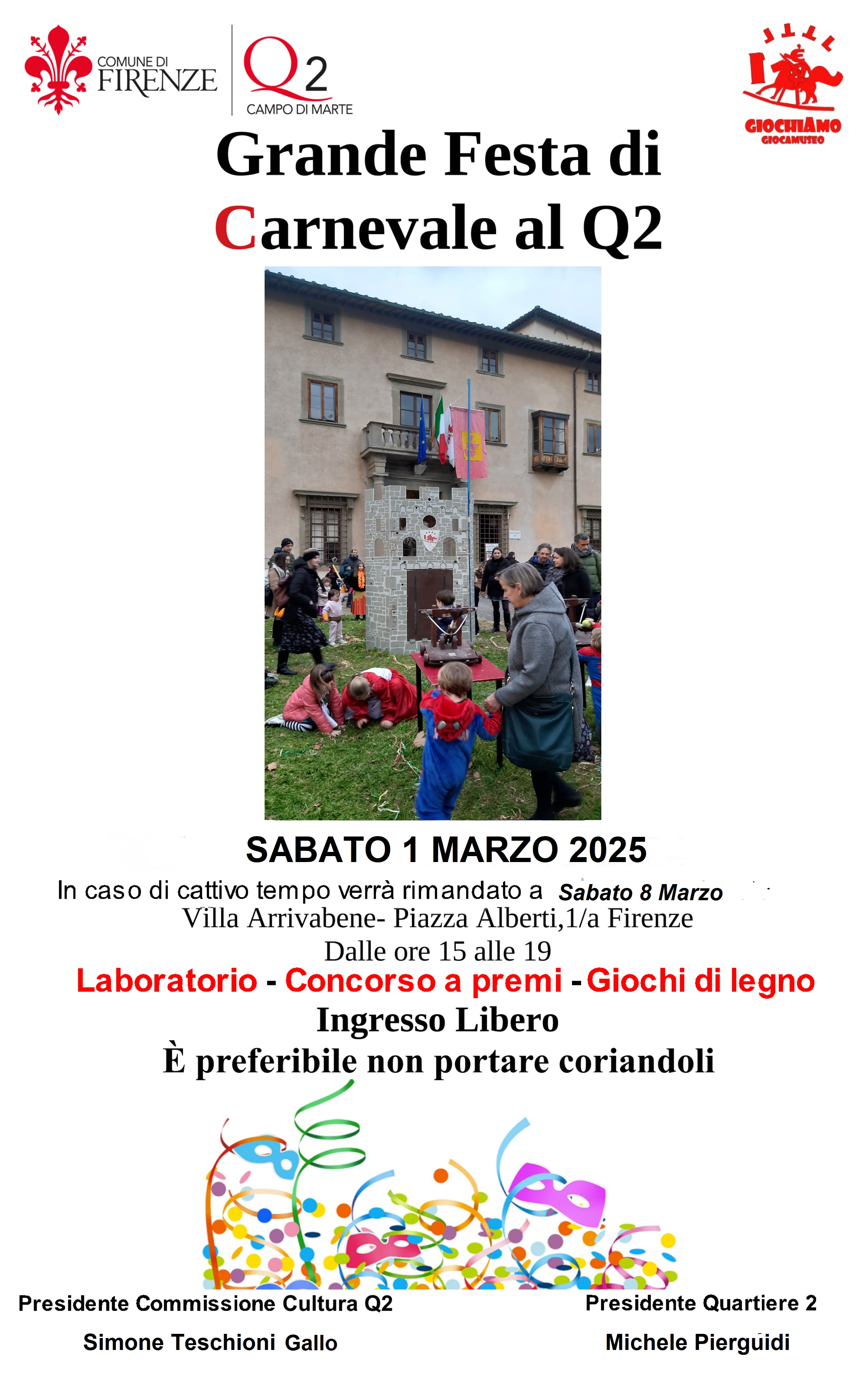Sabato 1 Marzo alle ore 15.00, nel Giardino di Villa Arrivabene, ci sarà la grande Festa di Carnevale, organizzata dall'APS Giochiamo Giocamuseo con la collaborazione del Quartiere 2. Giochi di legno interattivi, un laboratorio di costruzione giocattoli a tema carnevalesco e la premiazione per la maschera più bella, in un evento a ingresso libero e gratuito destinato interamente ai più piccoli.