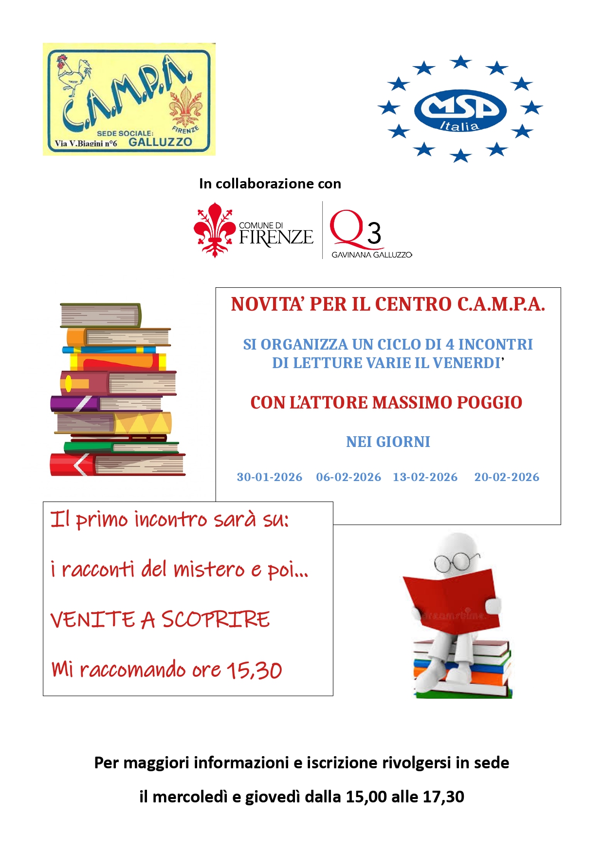 Il centro anziani CAMPA (in via Biagini, 6 - Firenze) organizza un ciclo di letture con l'attore Massimo Poggio.
