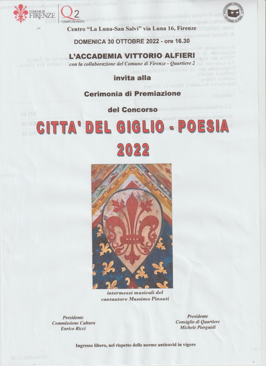 Il 30 Ottobre 2022 alle ore 16.30, presso il Centro Età Libera "La Luna - San Salvi" sito in Via Luna n. 16, si terrà la cerimonia di premiazione del concorso di poesia "Città del Giglio 2022", promosso dall'Accademia Vittorio Alfieri. La cerimonia, ad ingresso libero, sarà arricchita dagli intermezzi musicali del cantautore Massimo Pinzuti.