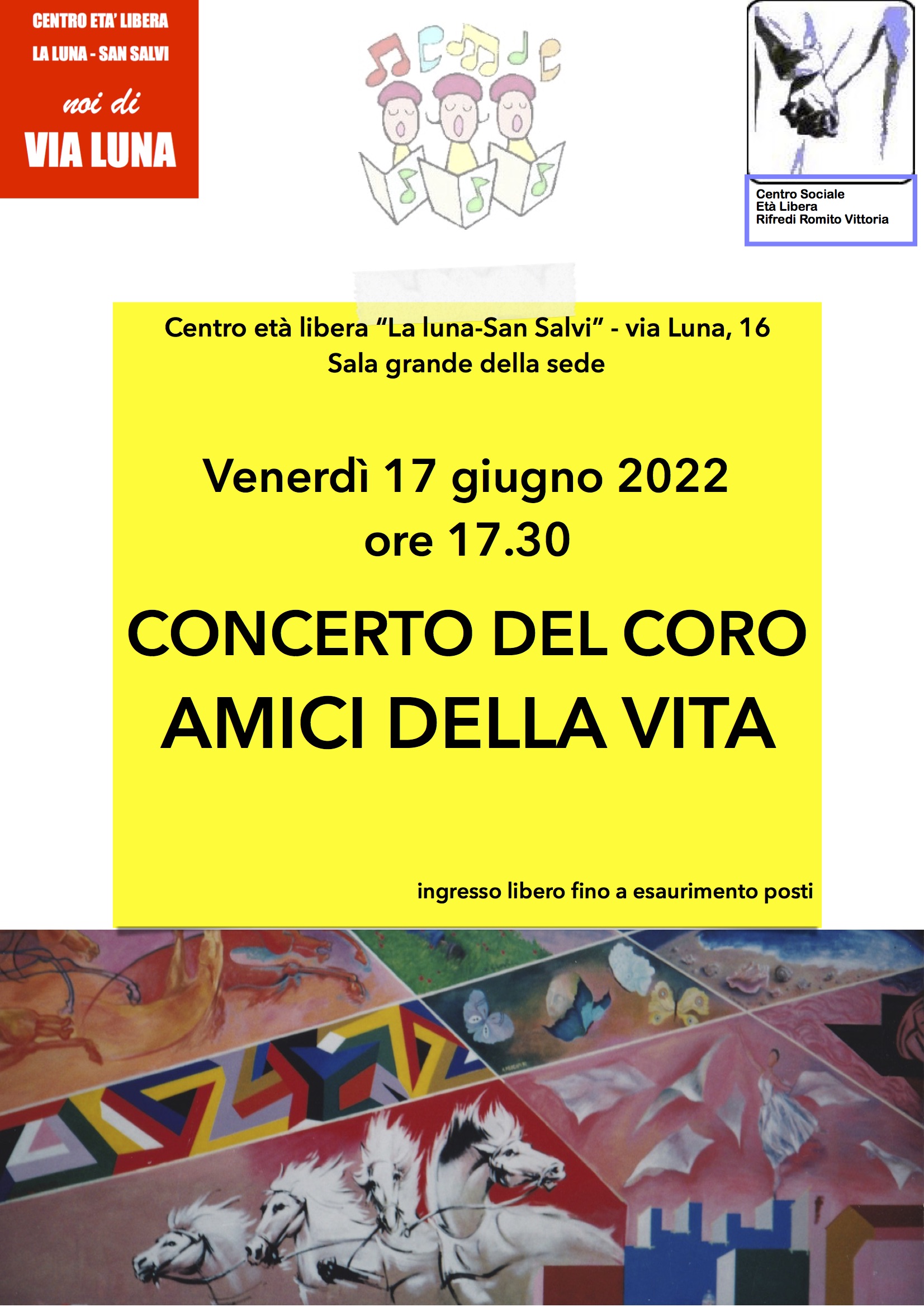 Presso la Sala grande del Centro Età Libera "La Luna - San Salvi" (via La Luna n. 16) il concerto tenuto dal coro "Amici della vita", diretto dal maestro Ippolita Nuti, ad ingresso libero fino ad esaurimento posti.