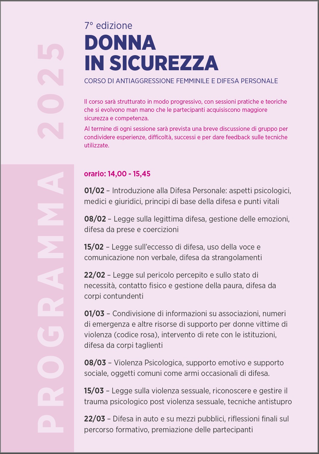 Ogni sabato di febbraio e di marzo, presso la palestra Firenze Marathon Wellness, si terrà, dalle ore 14.00 alle ore 15.45, una lezione specifica sull'aspetto legislativo, sull'aspetto psicologico o sulle tecniche di difesa personale, a cura di operatori del settore quali istruttori di difesa personale, psicologhe, avvocati, medici e forze dell'ordine.
