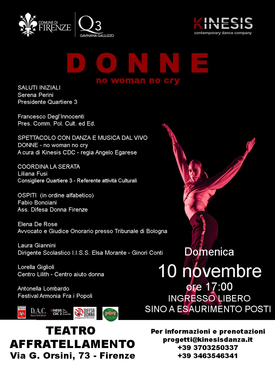 In occasione della giornata internazionale per l'eliminazione della violenza contro le donne del 25 novembre la compagnia  Kinesis si esibirà in uno spettacolo di danza e musica dal vivo ad ingresso libero sino ad esaurimento posti.