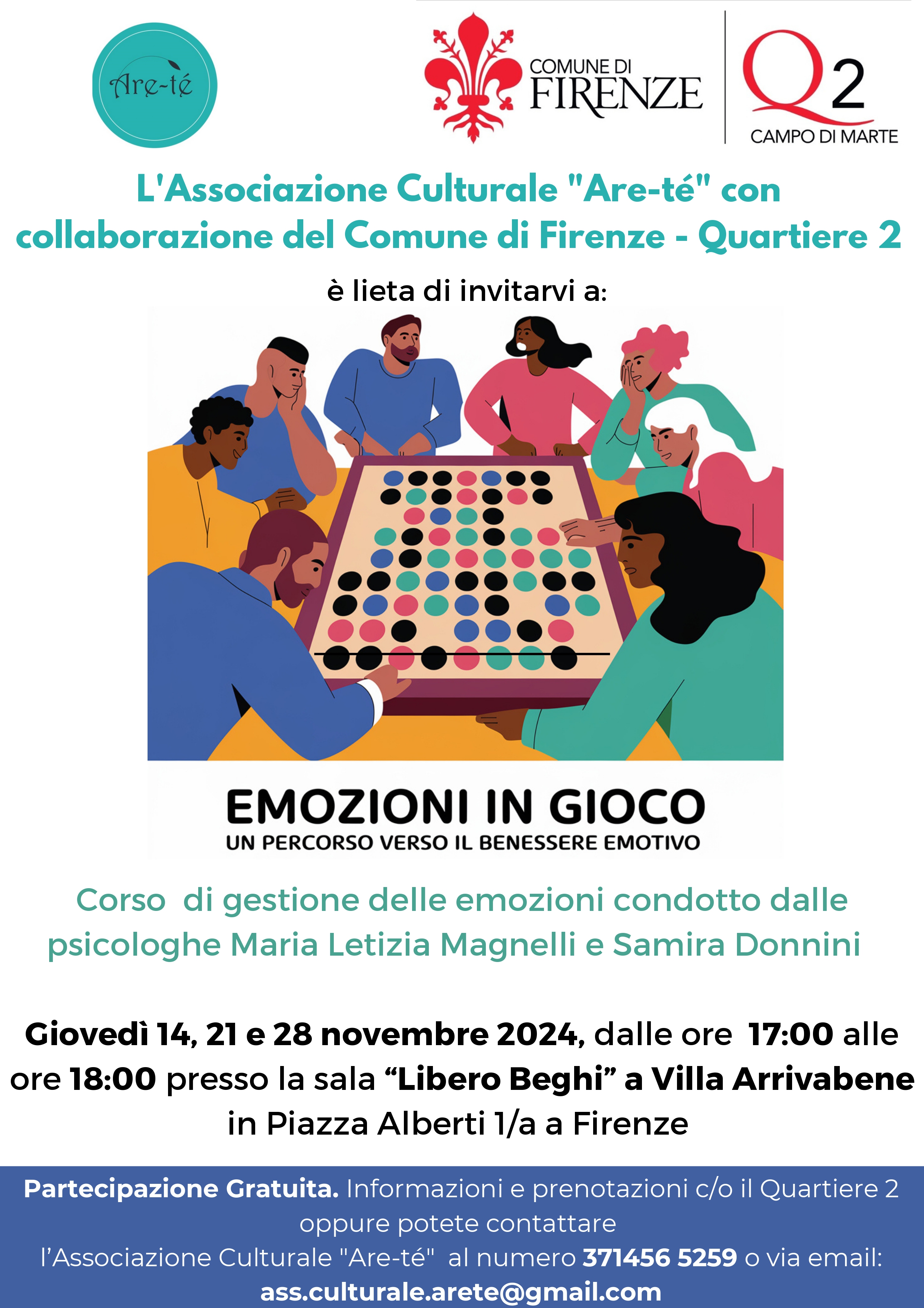 Lo stress, l'ansia e la depressione sono problemi sempre più diffusi che influenzano negativamente la qualità della vita e le relazioni interpersonali; riconoscere e gestire le proprie emozioni è fondamentale per affrontare queste sfide e promuovere un senso di benessere individuale e collettivo. Da questa necessità nasce "Emozioni in gioco - Un percorso verso il benessere emotivo", un corso di tre incontri a cura dell'Associazione Culturale Are-té con la collaborazione del Quartiere 2 rivolto a tutti i cittadini interessati a migliorare la propria qualità della vita e a sviluppare una maggiore consapevolezza di sé e delle proprie emozioni.