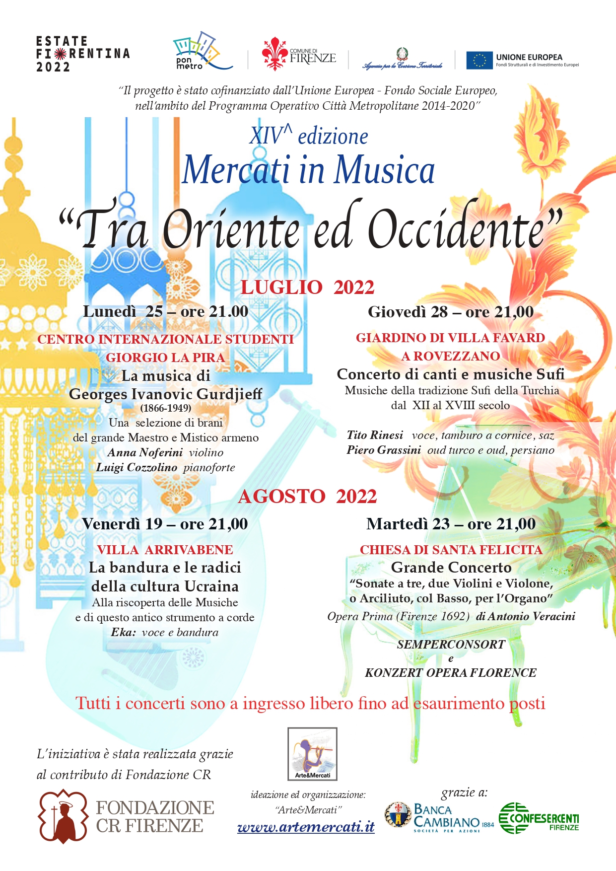 Torna la quattordicesima edizione della rassegna "Mercati in Musica", promossa dall'Associazione Culturale "Arte e Mercati" con il sostegno di Confesercenti, con quattro spettacoli musicali e di intrattenimento gratuiti mirati all'incontro di generi musicali diversi e alla creazione di contaminazioni e forme di espressione nuove, suggestive e coinvolgenti, in luoghi di grande interesse storico-artistico a Firenze. Lungo gli itinerari commerciali tracciati da Marco Polo, dalla Compagnia delle Indie, dalle rotte balcaniche, l’enorme bagaglio culturale delle antiche civiltà orientali ci introduce a stili di vita, filosofie e spiritualità differenti, evidenziando, attraverso la musica, i secolari rapporti tra mondo “occidentale” e “orientale”.