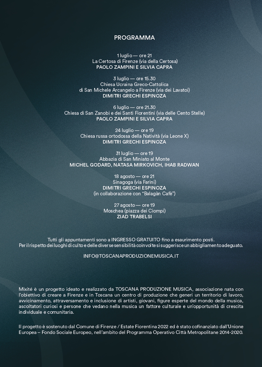Il progetto MIXITÈ, ideato e realizzato da TOSCANA PRODUZIONE MUSICA, porta alcuni dei musicisti più sensibili della scena nazionale e internazionale a far emergere i suoni peculiari dei luoghi coinvolti attraverso esecuzioni che ne rispettino e valorizzino la storia e le culture di riferimento.