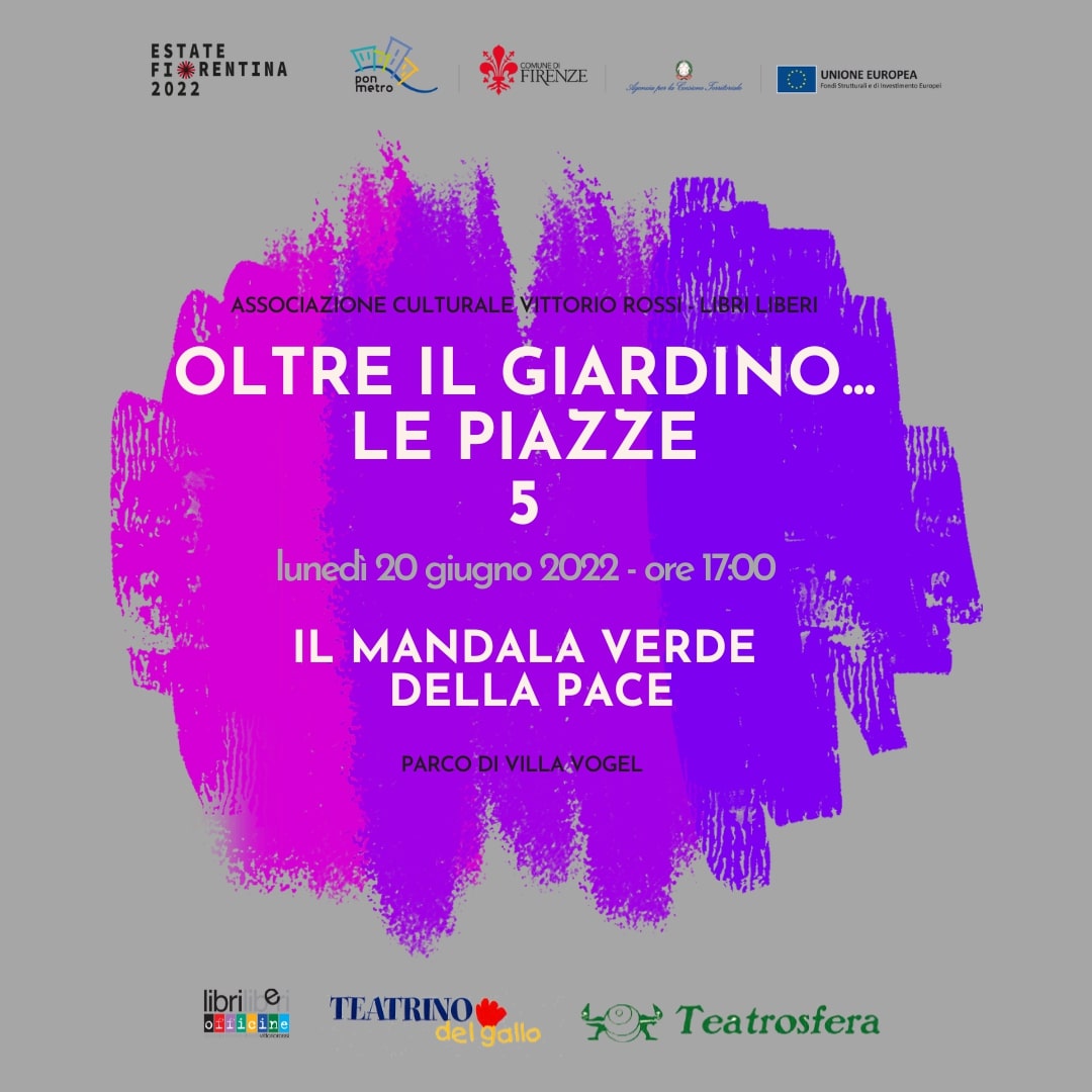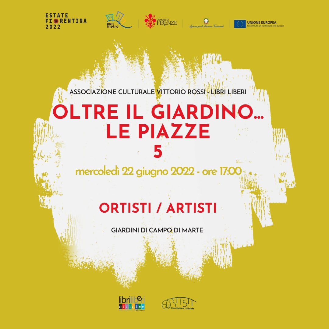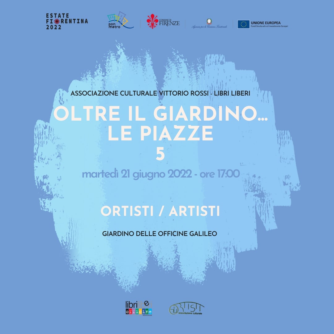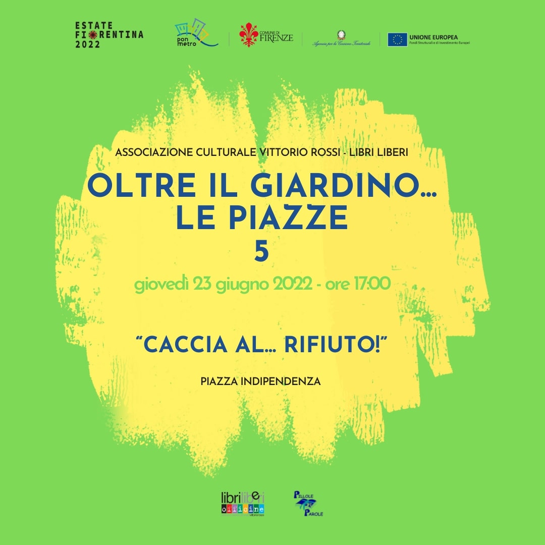 L’Estate Fiorentina prosegue con un calendario di eventi promossi dall’Associazione di Promozione Sociale "Vittorio Rossi – Libri Liberi" nell'ambito del progetto “OLTRE IL GIARDINO… LE PIAZZE 5!”. Teatro, letteratura, arte e ambiente sono al centro degli appuntamenti disseminati in 5 location della città, sempre alle 17:00 e sempre con i bambini protagonisti; un programma di eventi con un linguaggio immediato, fantasioso e in grado di creare una situazione empatica in cui il gioco, il racconto e lo stare insieme siano elementi di conoscenza e di educazione.