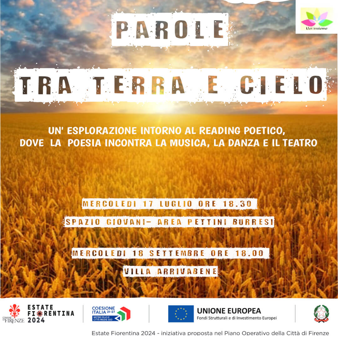 Mercoledì 18 Settembre alle ore 18.00, nella Sala Libero Beghi in Villa Arrivabene, si terrà l'evento "Parole tra cielo e Terra", a cura dell'associazione Noi Insieme con il contributo dell'Estate Fiorentina. Una performance che esplora il tema Natura in un itinerario dove poesia, musica e teatro-danza si incontrano e dove trovano rappresentazione i quattro elementi base della natura: Terra, Aria, Acqua e Fuoco, archetipi primordiali e forme primarie di energia dentro e fuori di noi.
