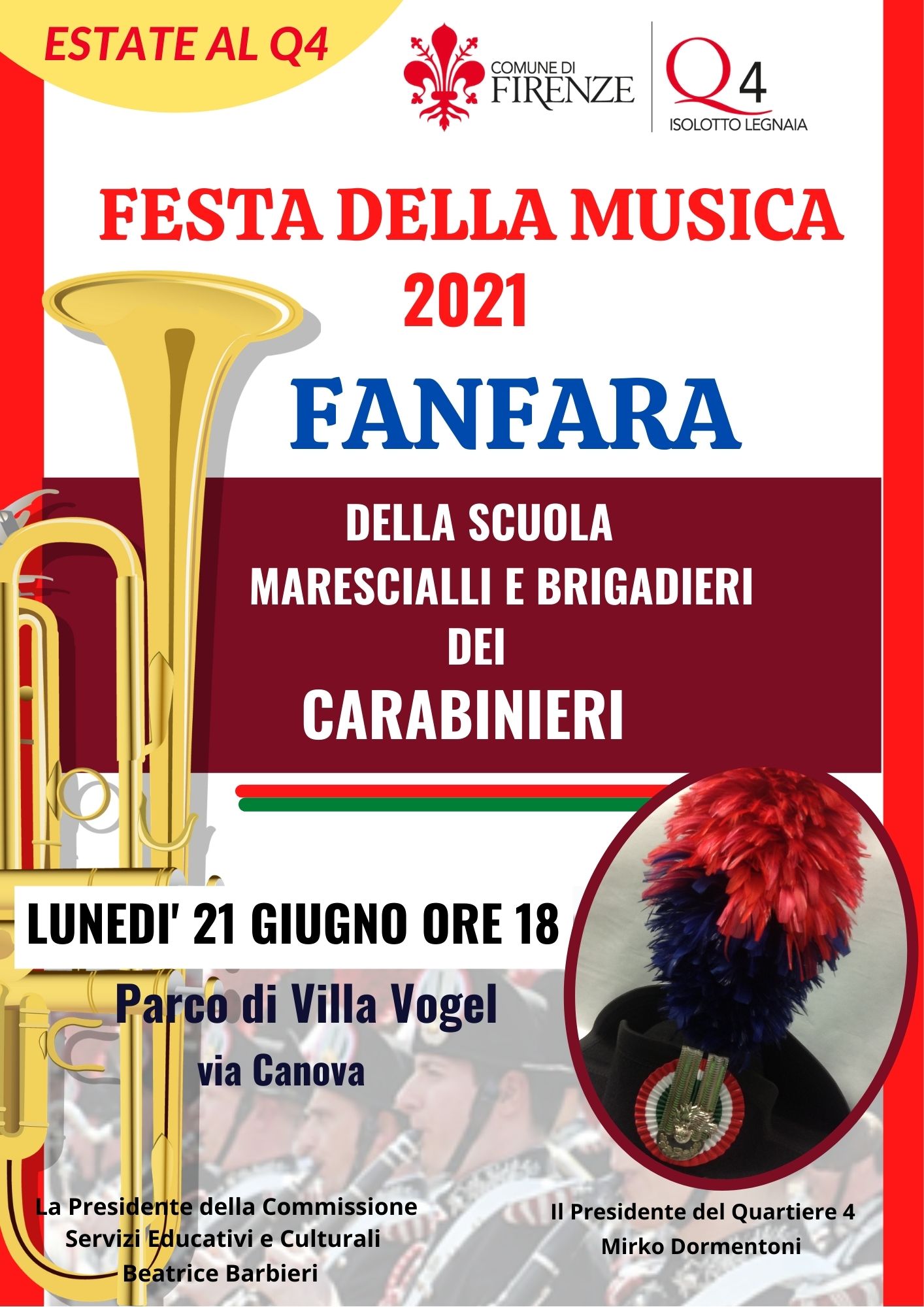 La rassegna gratuita di eventi estivi del Quartiere 4 ‘Estate Q4’ partirà a Villa Vogel, nelle due sedi dell'Arena Estiva nel Parco e del Chiostro all'interno della Villa, con la 'Festa della Musica 2021'.