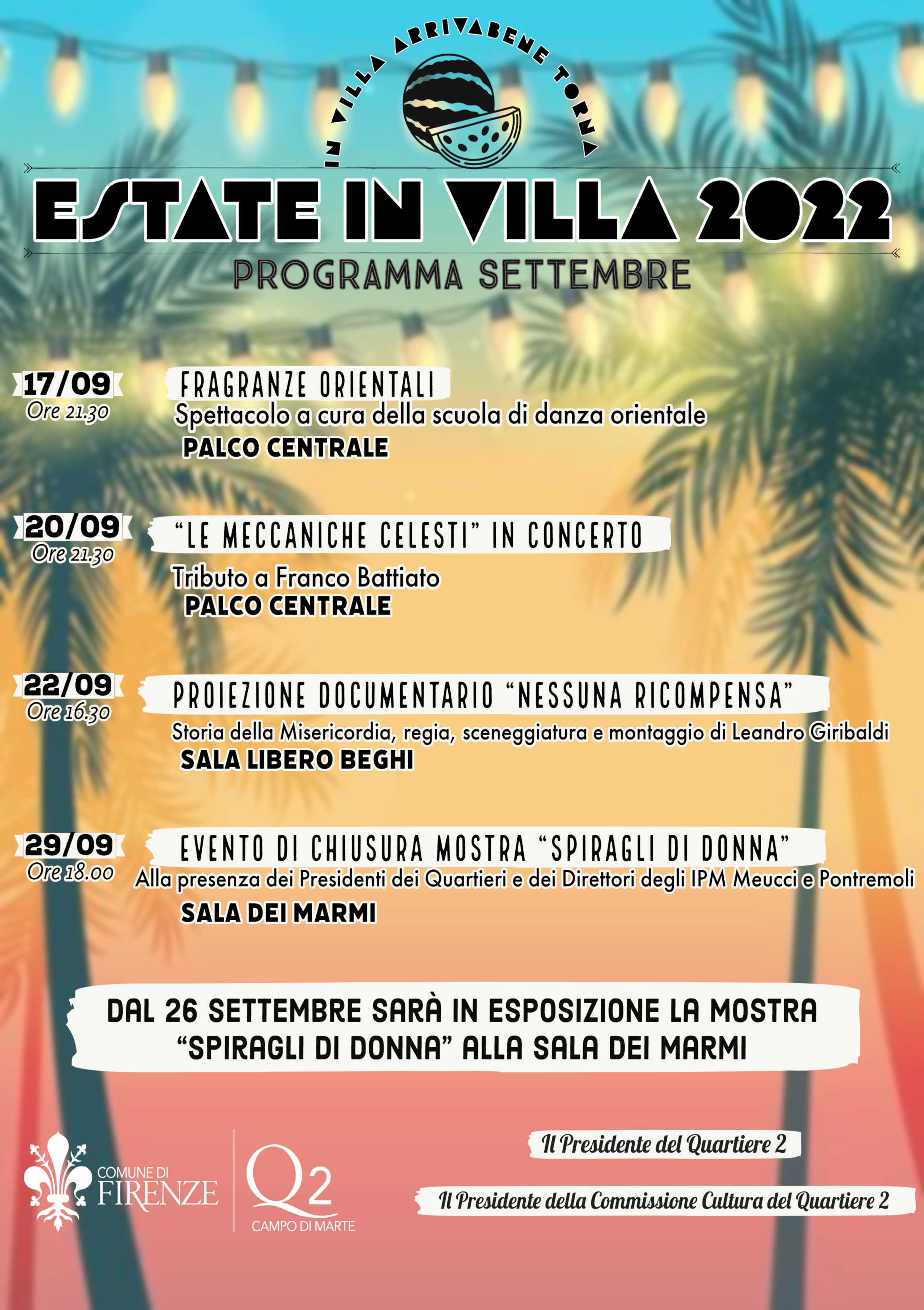 Si chiude l'Estate in Villa al Quartiere 2 con gli eventi della rassegna di Settembre, tra spettacoli di danza, concerti, documentari e mostre; un calendario di eventi ad ingresso libero e gratuito.