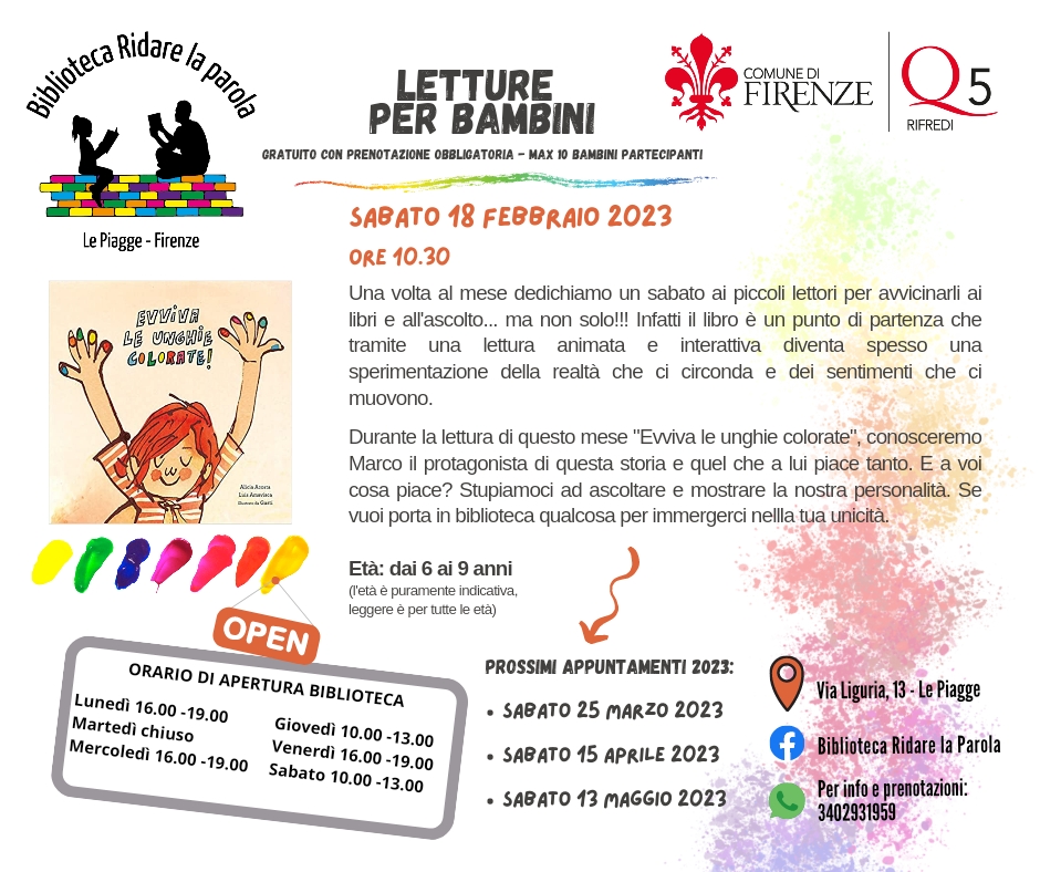 Sabato 18 febbraio, alle ore 10.30, organizza una lettura per bambini dai 6 ai 9 anni di età dal titolo “Evviva le unghie colorate”, dove i piccoli ascoltatori conosceranno Marco, il protagonista della storia, e quello che gli piace tanto. Se vogliono, i bambini possono portare una cosa a cui sono particolarmente affezionati.
