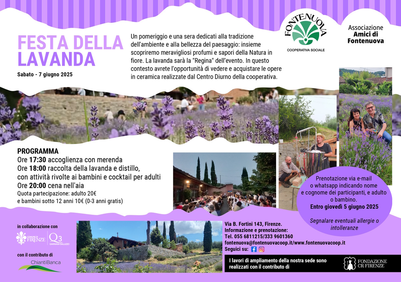 Sabato 7 giugno 2025 presso la Cooperativa Fontenuova (in via Benedetto Fortini, 143, Firenze) si svolgerà la festa della lavanda: un pomeriggio e una sera dedicati alla tradizione dell'ambiente e alla bellezza del paesaggio.
