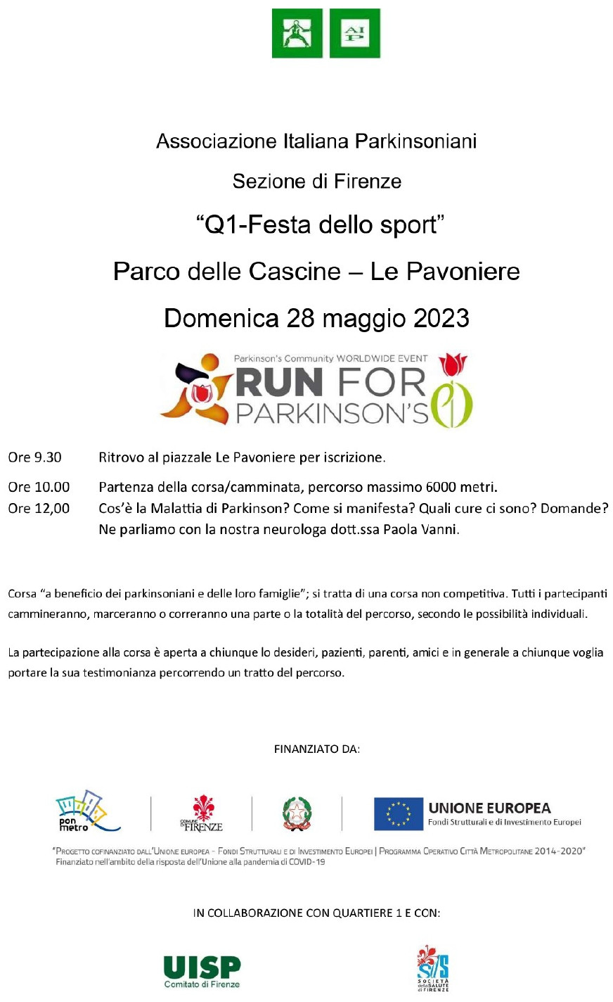 Domenica 28 maggio è prevista la corsa/camminata Run for Parkinson's, con ritrovo alle ore 9.30 presso il Piazzale le Pavoniere per l'iscrizione. Alle ore 12.00 si terrà un incontro con una dottoressa specialista in Neurologia, che parlerà della malattia di Parkinson.