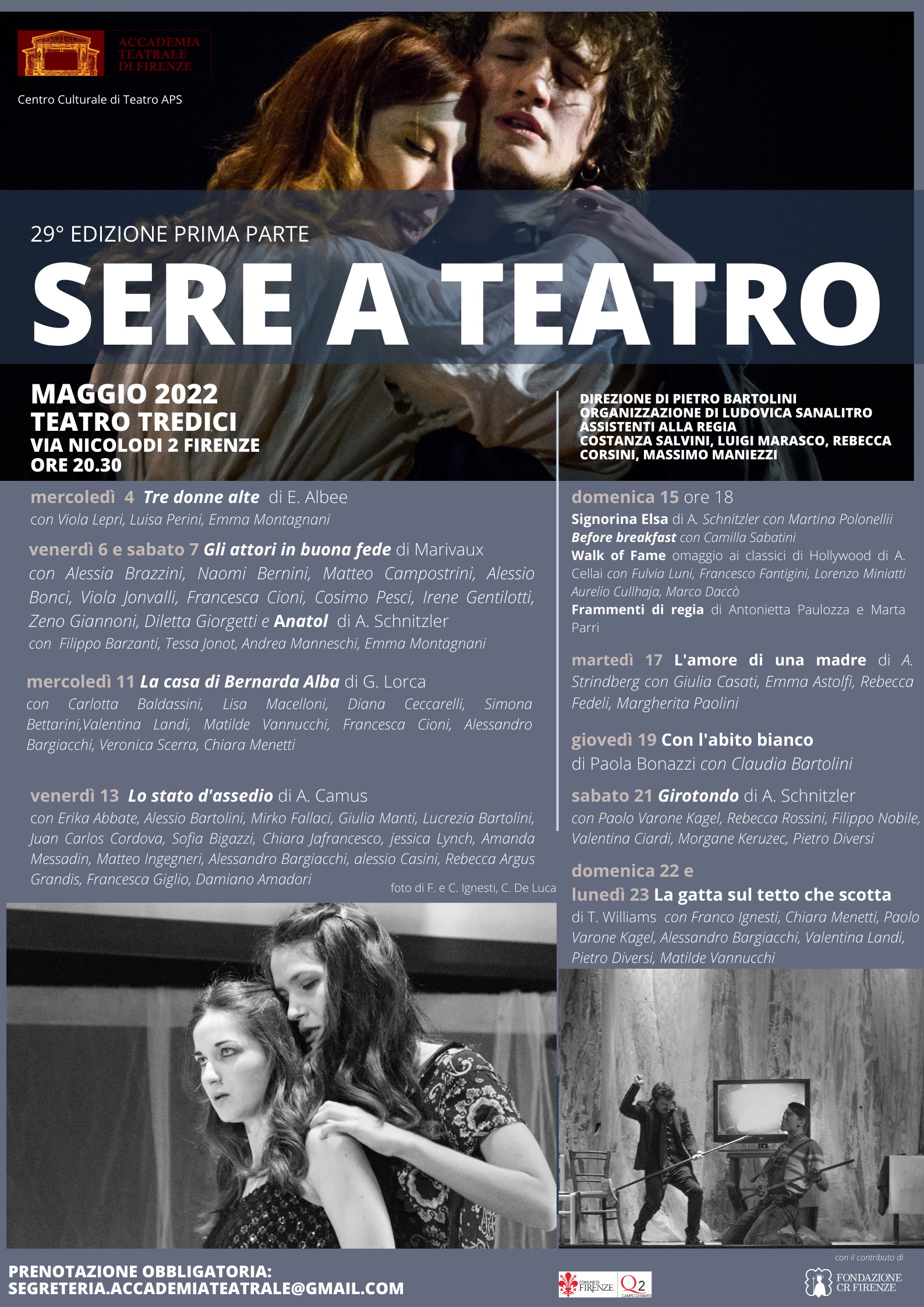 Al Teatro Tredici di Firenze, in via Nicolodi, 2, dal 4 al 23 maggio 2022 va in scena la prima parte della ventinovesima edizione della rassegna teatrale Sere a Teatro una serie di spettacoli e studi drammaturgici con protagonisti oltre novanta giovani attori formatisi all'Accademia Teatrale di Firenze.