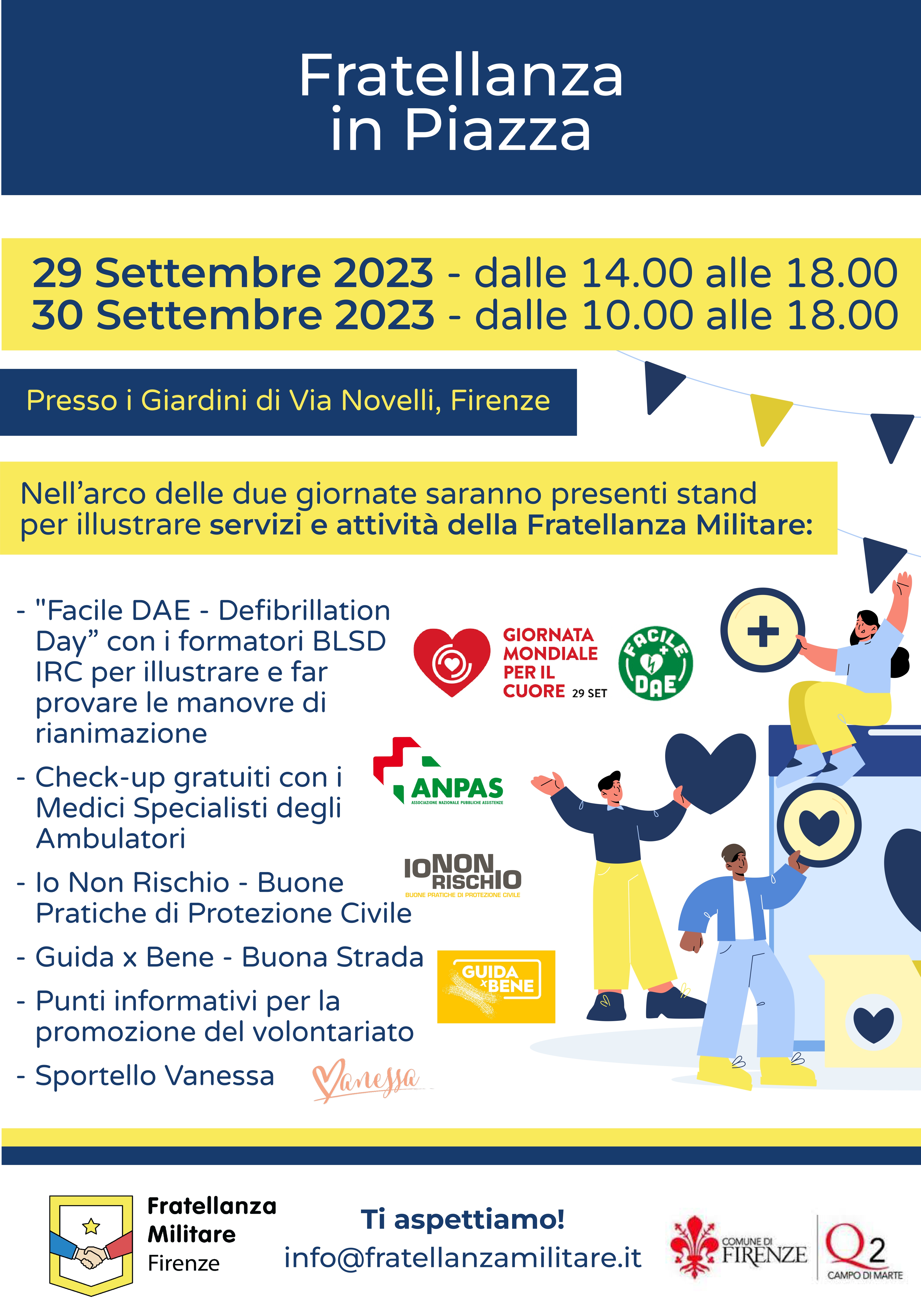 La Fratellanza Militare di Firenze scende in piazza per due giornate illustrative dei servizi e delle attività destinate, a titolo gratuito, alla cittadinanza; Venerdì 29 Settembre, dalle ore 14.00 alle ore 18.00, e Sabato 30 Settembre, dalle ore 10.00 alle ore 18.00, presso i Giardini di Via Novelli, saranno presenti diversi stand informativi per illustrare le manovre di rianimazione, per effettuare dei check-up gratuiti, per informare sulle buone pratiche di protezione civile e di guida, nonché per informare e promuovere le attività di volontariato.