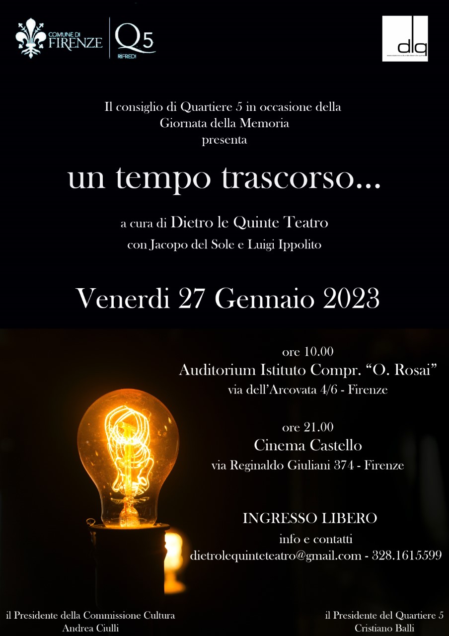 Il Consiglio di Quartiere 5 e l’Associazione Culturale Dietro le Quinte Teatro, in occasione della Giornata della Memoria, presentano “Un tempo trascorso…”, una lettura drammatizzata di alcune testimonianze rilasciate dai deportati durante l’Olocausto affiancate a conflitti, oppressioni e rivolte di oggi. Passato e presente si incontrano, per scoprire di non essere poi tanto distanti.