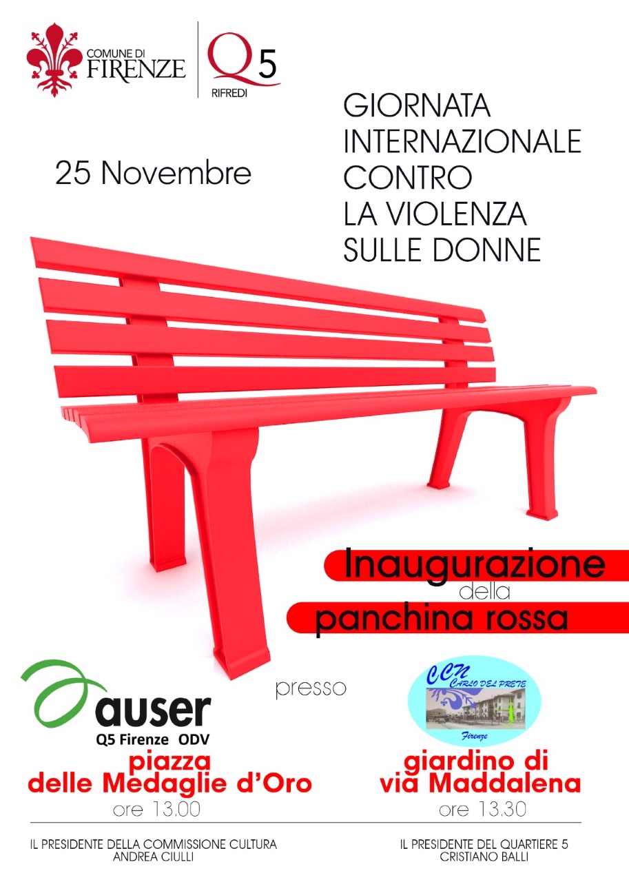 Mercoledì 25 novembre saranno inaugurate due panchine rosse, al giardino di piazza delle Medaglie d’Oro, in collaborazione con l’Associazione Auser, e al giardino di via Maddalena, in collaborazione con il CCN di via Carlo del Prete.