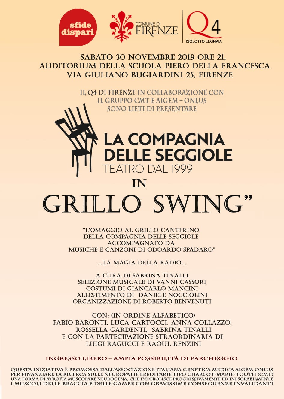 Sabato 30 novembre alle ore 21 nell’Auditorium della Scuola Piero della Francesca, via Giuliano Bugiardini 25, “la Compagnia delle Seggiole” torna in scena con “Grillo Swing” lo spettacolo omaggio al programma radio tanto amato dai fiorentini, “Il Grillo Canterino”, accompagnato da musiche e canzoni di Odoardo Spadaro.