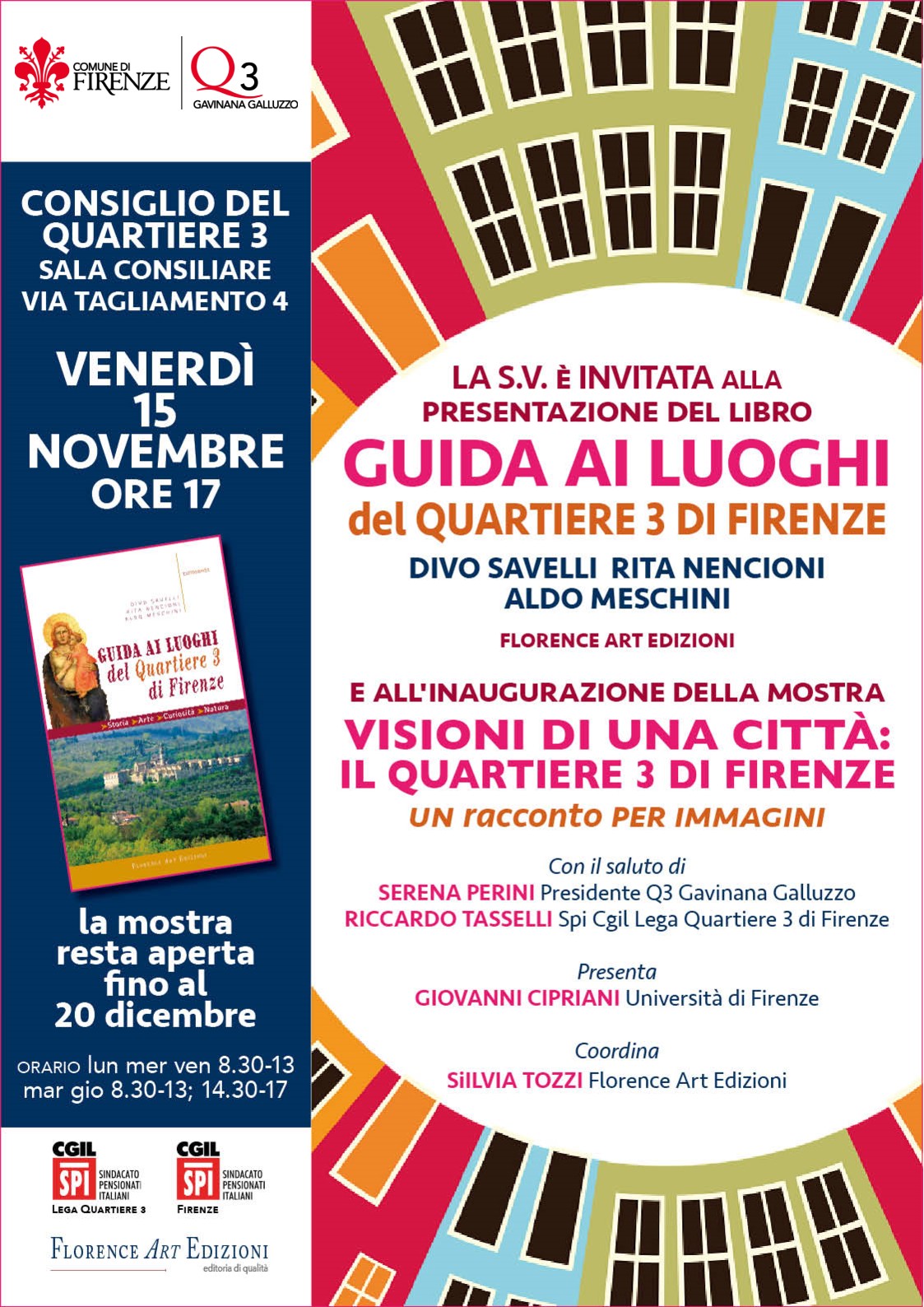Venerdì 15 Novembre 2024 si terrà alle ore 17 presso la sala consiliare del Quartiere 3 (via Tagliamento, 4 Firenze) la presentazione del libro "Guida ai luoghi del Quartiere 3" di Divo Savelli, Rita Nencioni e Aldo Meschini edito da Florence Art Edizioni e l'inaugurazione della mostra fotografica "Visioni di una città: il Quartiere 3 di Firenze".