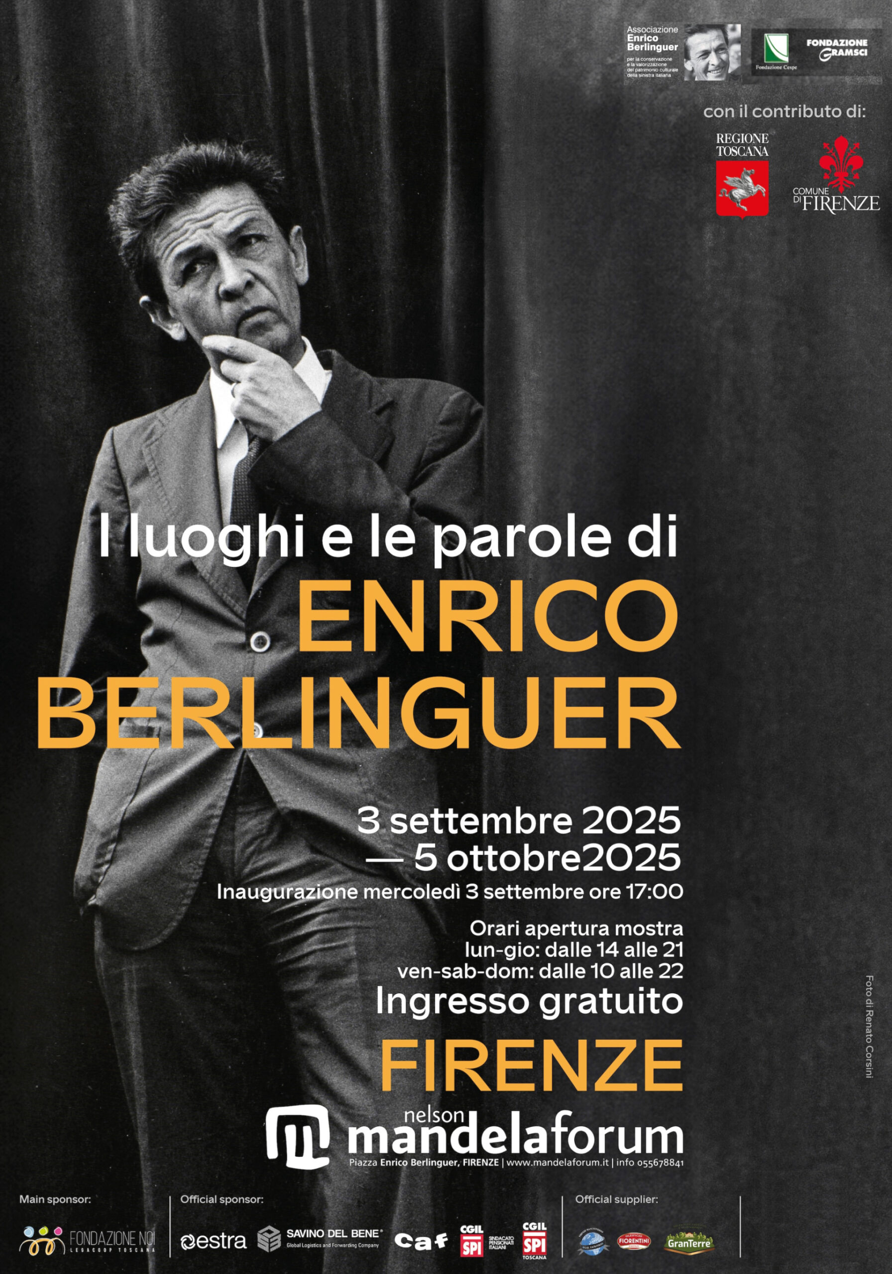 Dal 3 settembre al 5 ottobre 2025, il Nelson Mandela Forum ospiterà la mostra “I luoghi e le parole di Enrico Berlinguer”, realizzata dall'Associazione Enrico Berlinguer con il patrocinio della Regione Toscana e del Comune di Firenze.