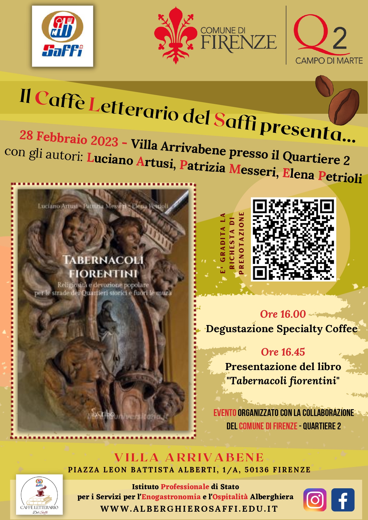 L'evento inizierà alle ore 16.00 con la degustazione dello "Specialty Coffee", a cui seguirà la presentazione del libro "Tabernacoli Fiorentini" alla presenza degli autori Luciano Artusi, Patrizia Messeri ed Elena Petrioli; per partecipare all'evento è preferibile effettuare la prenotazione, tramite l'apposito QR Code presente nella locandina.