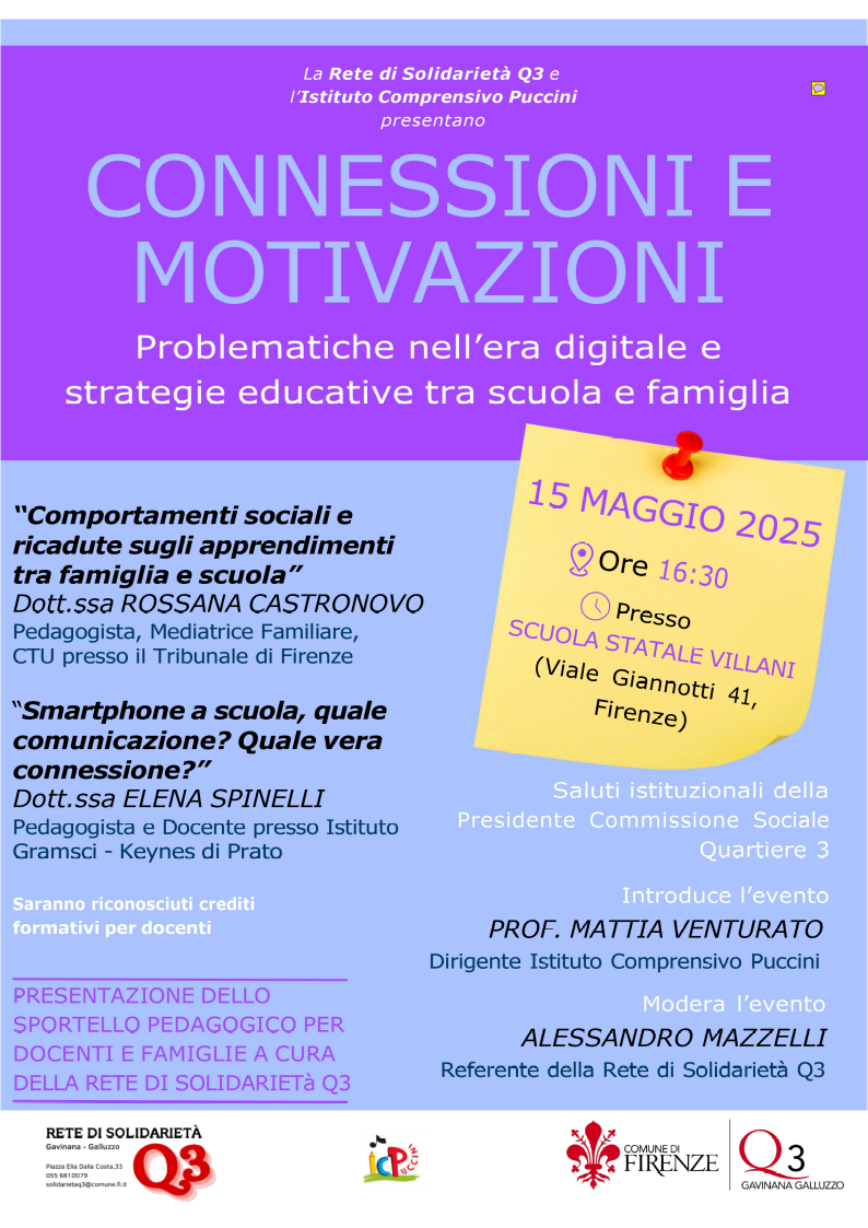 Il 15 maggio 2025 alle ore 16:30 presso la scuola Villani (viale Giannotti, 41 Firenze) si terrà un incontro organizzato dalla Rete di Solidarietà del Quartiere 3 e l'Istituto Comprensivo Puccini dal titolo "Connessioni e motivazioni - Problematiche nell'era digitale e strategie educative tra scuola e famiglia".