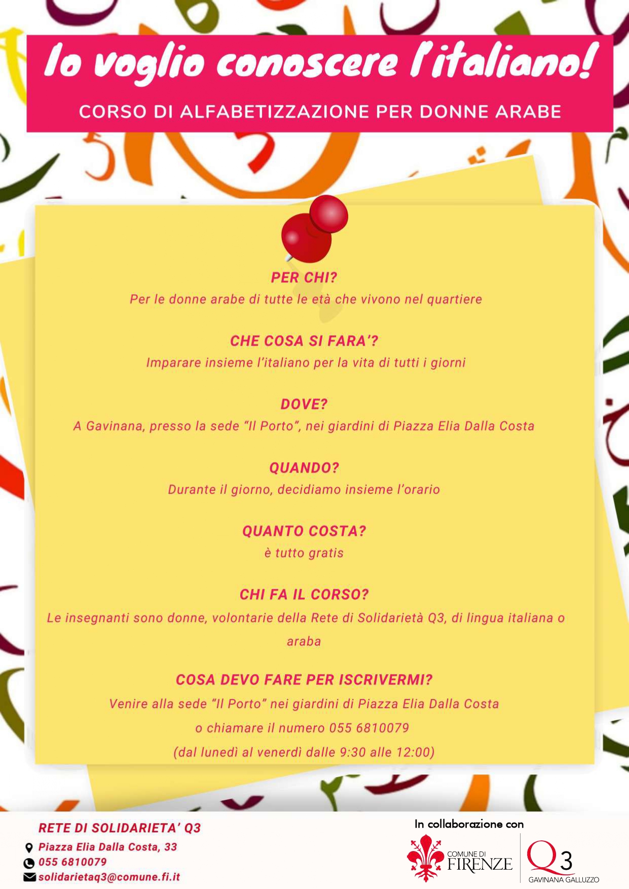 Al via nel Quartiere 3 il corso promosso dalla Rete di Solidarietà del Quartiere 3 che si prefigge di aiutare le donne arabe nella conoscenza della lingua italiana al fine di raggiungere il traguardo di leggere e scrivere in italiano.