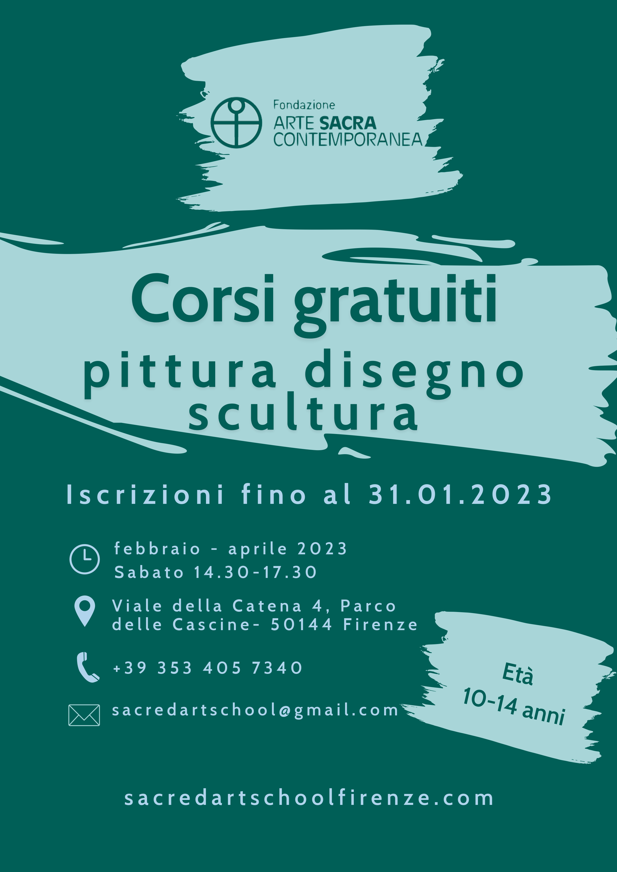I laboratori, previsti tra febbraio e aprile 2023, prevedono tre momenti ludico formativi incentrati su pittura, disegno e scultura, in moduli di 3 ore ciascuno; i corsi si svolgeranno presso le aule e i laboratori della Scuola di Arte Sacra, area Formativa della Fondazione per l’arte sacra contemporanea, a cura di docenti e artisti della Scuola di Arte Sacra;