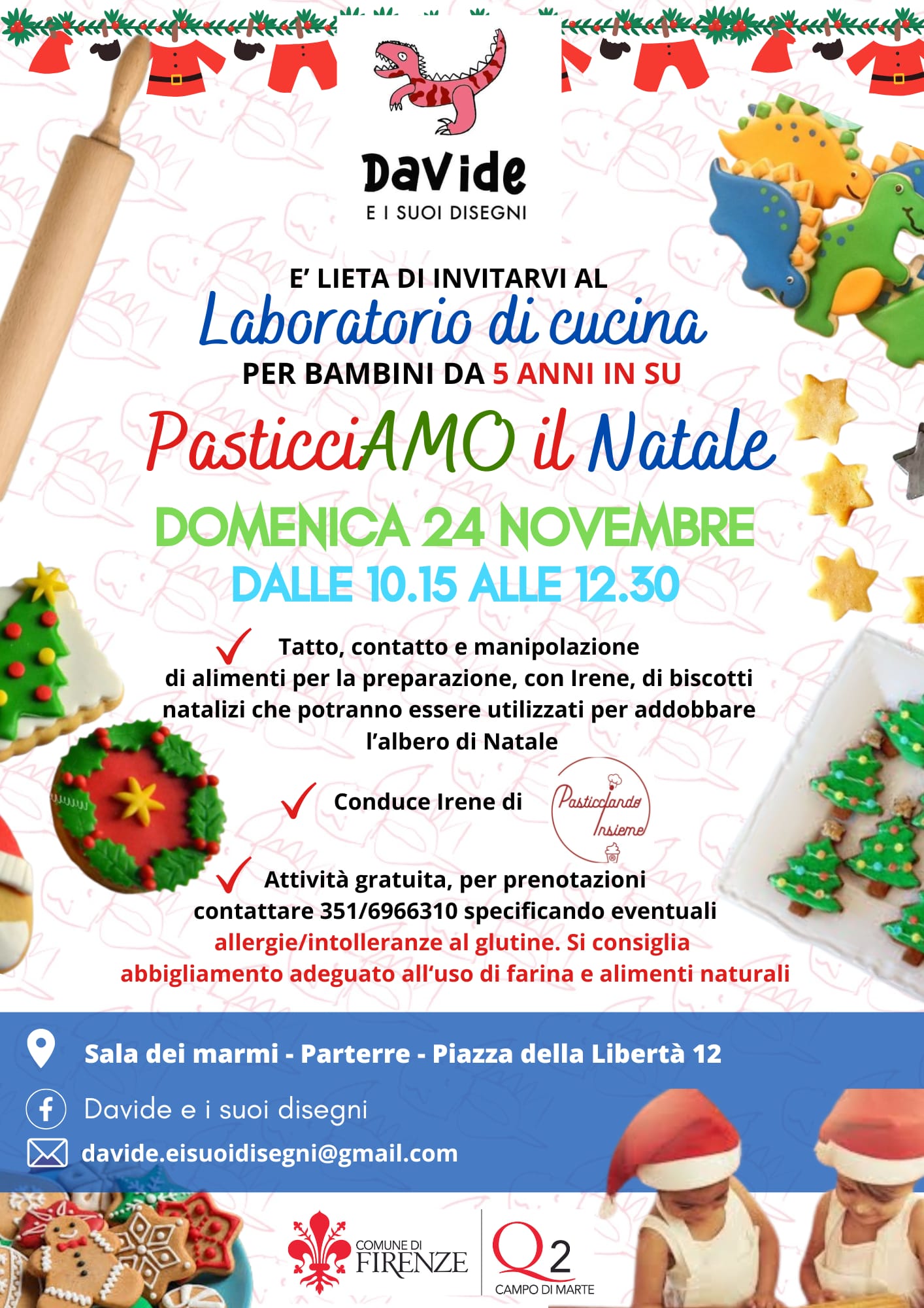 Domenica 24 Novembre 2024 dalle ore 10.15 alle ore 12.30, nella Sala dei Marmi al Parterre, si terrà il laboratorio di cucina per bambini "Pasticciamo il Natale", creato dall'organizzazione Davide e i suoi disegni con la conduzione di Irene di Pasticciando Insieme.