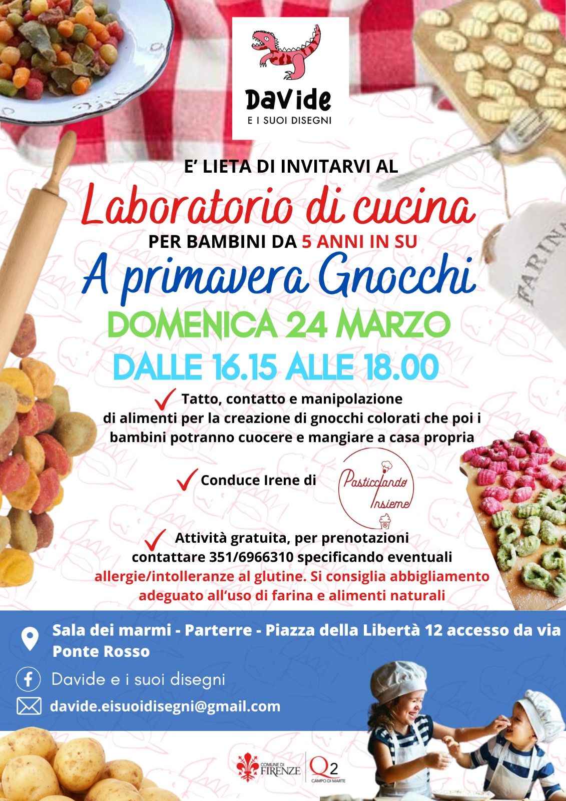Domenica 24 marzo dalle ore 16:15 alle ore 18:00, "Davide e i suoi disegni", terrà un laboratorio di cucina per bambini da 5 anni in su, presso la Sala dei Marmi in Piazza della Libertà, chiamato "A primavera Gnocchi". I bambini avranno la possibilità di stare a contatto con alimenti e manipolarli per la creazione di gnocchi colorati che poi potranno cuocere e mangiare a casa propria. Il laboratorio sarà condotto da Irene di "Pasticciando Insieme".