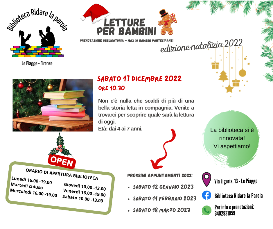 Sabato 17 dicembre, alle ore 10.30, i volontari della biblioteca organizzano una lettura gratuita per bambini dai 4 ai 7 anni.
