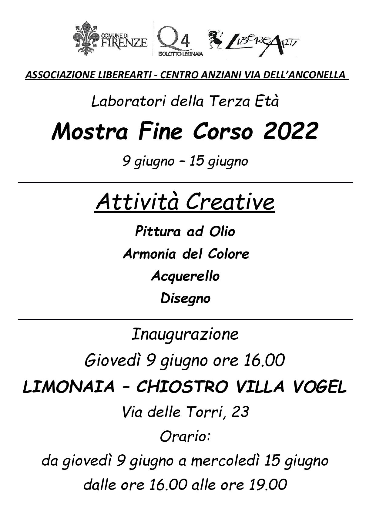 L’Associazione Liberearti - Centro Anziani Via dell’Anconella presenta la Mostra Fine Corso 2022 dei Laboratori della Terza Età, in svolgimento fino a mercoledì 15 giugno nella Limonaia e nel Chiostro di Villa Vogel, Via delle Torri 23, Firenze.