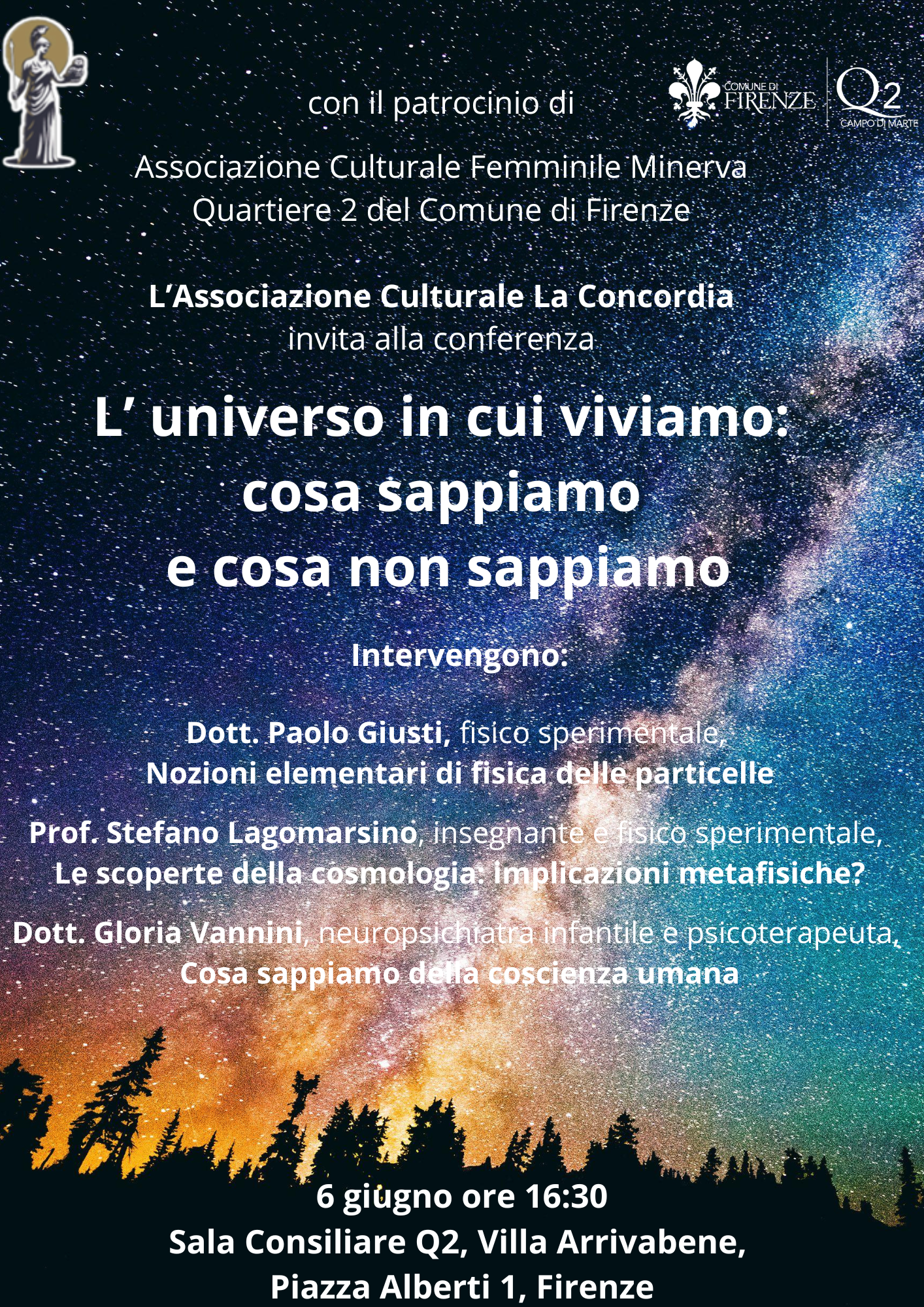 Giovedì 6 giugno alle ore 16:30, presso Villa Arrivabene, si terrà la conferenza "L'universo in cui viviamo: cosa sappiamo e cosa non sappiamo" a cura dell'associazione culturale "La Concordia". Interverranno: il Dott. Paolo Giusti, fisico sperimentale; il Prof. Stefano Lagomarsino, insegnante e fisico sperimentale; la Dott.ssa Gloria Vannini, neuropsichiatra infantile e psicoterapeuta.
