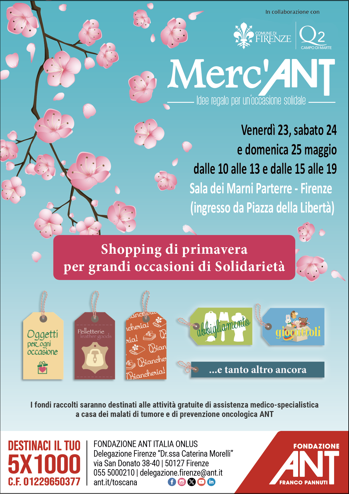 Torna il Merc'ANT con l'edizione primaverile del 2025, il mercatino solidale proposto da Fondazione ANT Onlus con la collaborazione del Quartiere 2 i cui proventi andranno interamente a sostenere le attività di assistenza domiciliare e specialistica che ANT offre gratuitamente ai malati di tumore e alle loro famiglie in 10 regioni italiane tra cui la Toscana (dove opera a Firenze, Prato, Pistoia) e i progetti di prevenzione oncologica sempre gratuiti portati avanti dalla Fondazione.