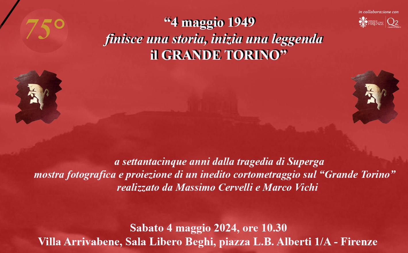 Sabato 4 maggio alle ore 10:30, presso Villa Arrivabene, si terrà la mostra fotografica "4 maggio 1949 finisce una storia, inizia una leggenda il Grande Torino" con la proiezione di un inedito cortometraggio sul "Grande Torino" realizzato da Massimo Cervelli e Marco Vichi.