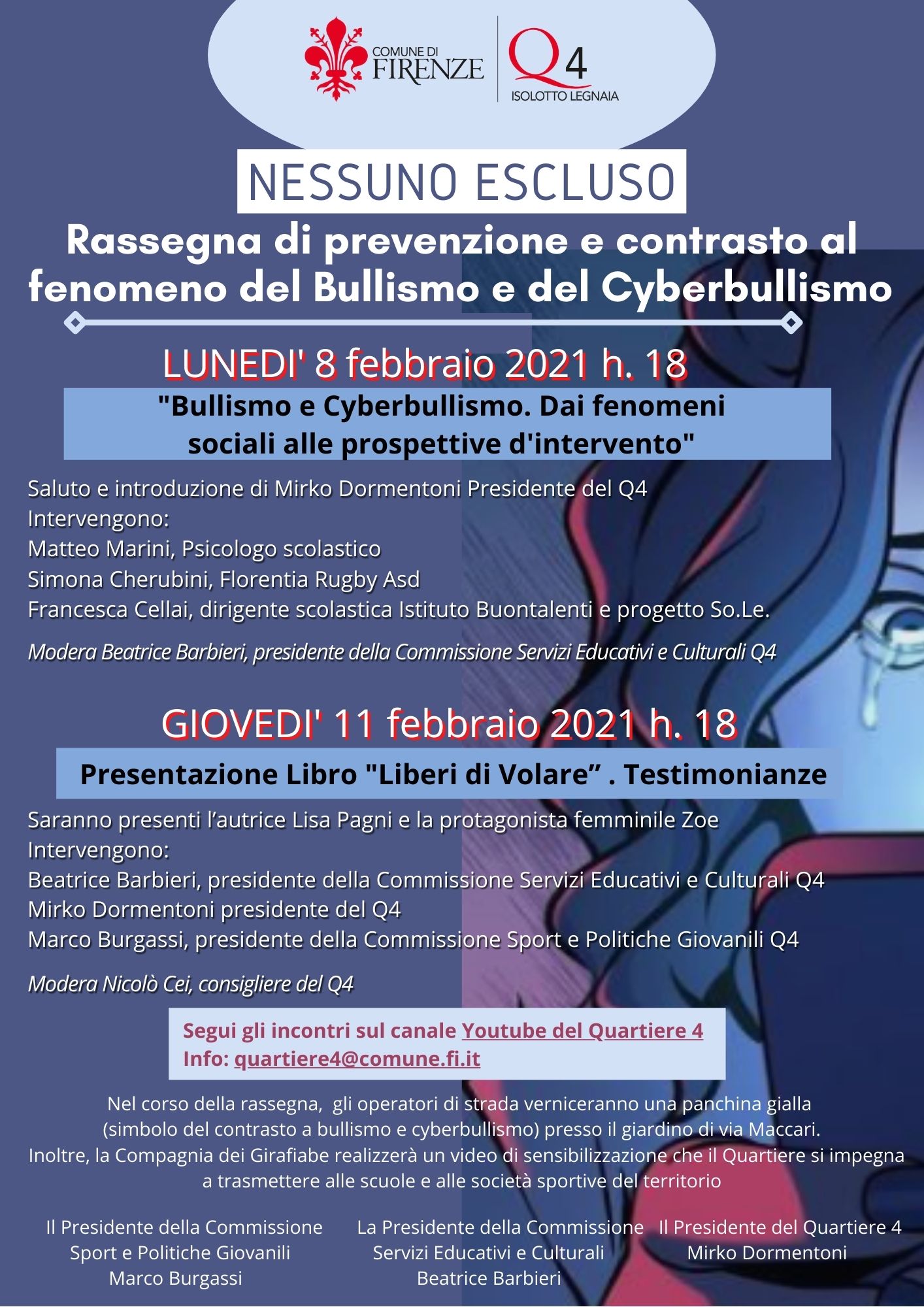 • Lunedì 8 febbraio 2021 h 18: “Bullismo e cyberbullismo. Dai fenomeni sociali alle prospettive d’intervento”. Saluto e introduzione di Mirko Dormentoni, Presidente del Quartiere 4. Intervengono: Matteo Marini, psicologo scolastico; Simona Cherubini, Florentia Rugby Asd; Francesca Cellai, dirigente scolastica Istituto Buontalenti e progetto So.Le.