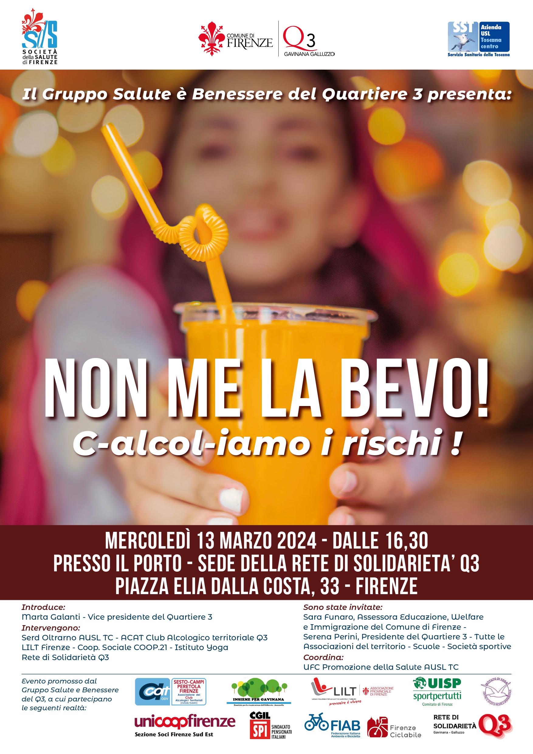 Mercoledì 13 marzo 2024 alle ore 16:30 presso Il Porto (sede della Rete di Solidarietà del Quartiere 3, in piazza Elia dalla Costa, 33) il gruppo Salute è Benessere del Quartiere 3 organizza un incontro in collaborazione con ACAT, SERD, Coop 21, Lilt Firenze e Rete di Solidarietà per parlare di prevenzione dei disturbi legati all’alcol.