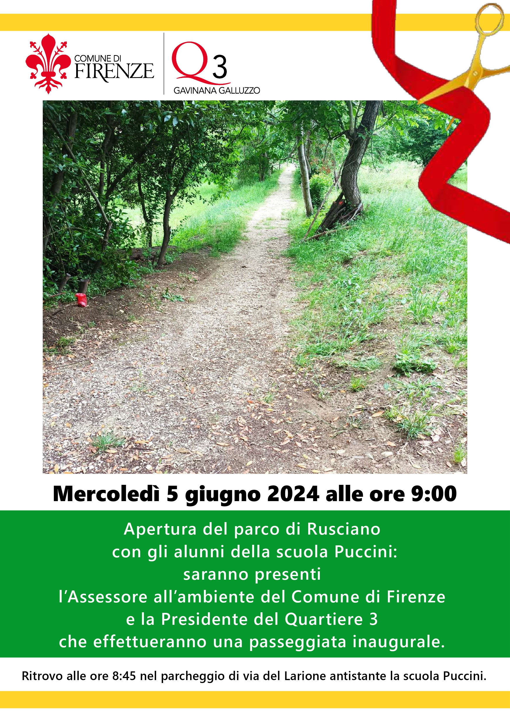 Mercoledì 5 giugno 2024 alle ore 9:00 si terrà l'apertura del nuovo camminamento nel parco di Rusciano con gli alunni della scuola Puccini: saranno presenti l’Assessore all’ambiente del Comune di Firenze e la Presidente del Quartiere 3 che effettueranno una passeggiata inaugurale.