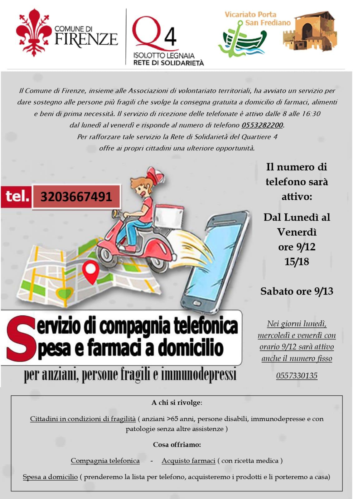 Grazie alla Rete di Solidarietà del Quartiere 4, in collaborazione con il Vicariato Porta San Frediano, prende il via il servizio di compagnia telefonica e consegna gratis della spesa alimentare e dei farmaci per le persone anziane e fragili. Servizio attivo da venti anni nel Quartiere 2, dove viene rafforzato in questi giorni di emergenza causata dal Coronavirus.