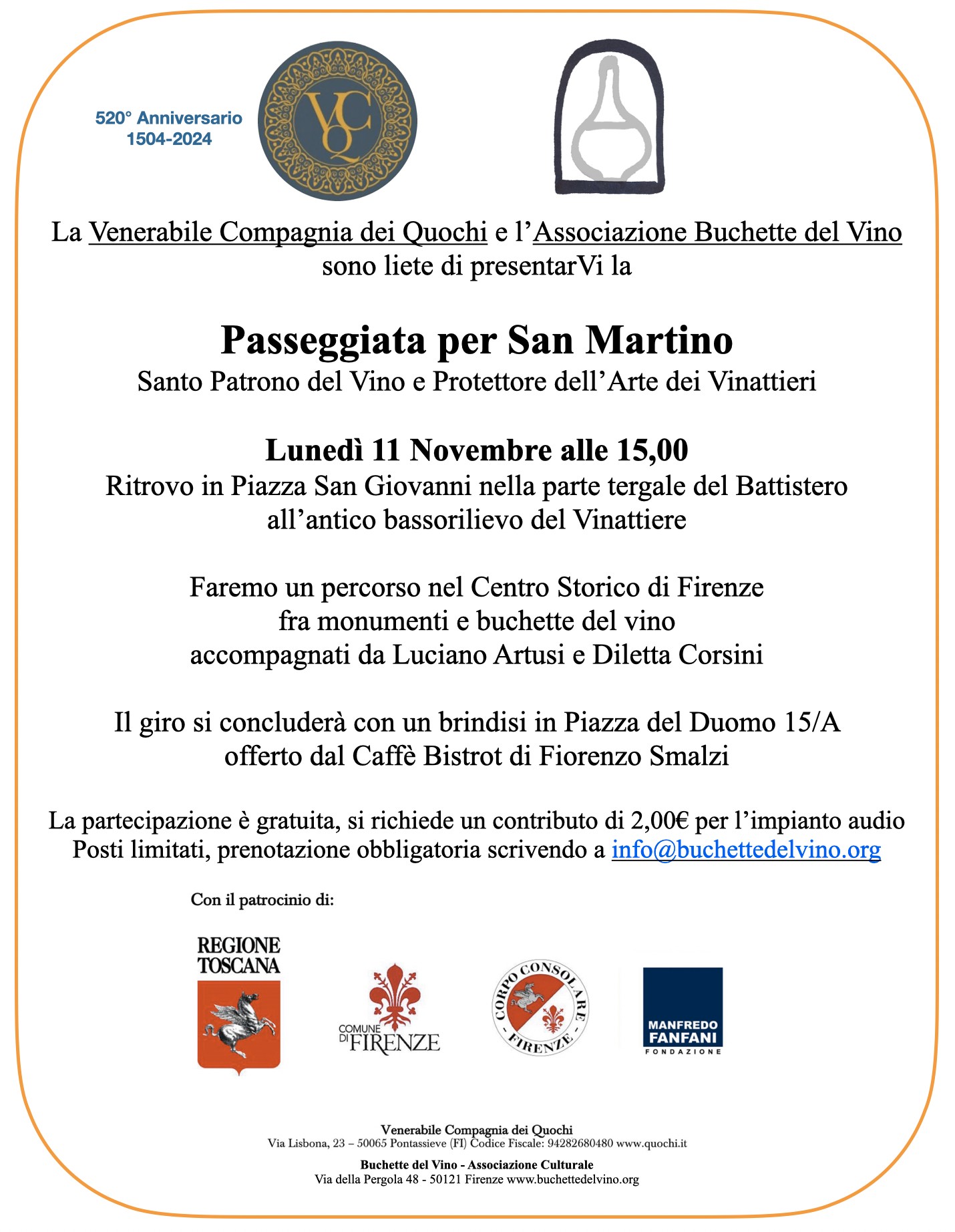 Firenze possiede ancora, in case e palazzi all’interno delle sue antiche mura, più di 150 storici finestrini per la “vendita diretta” del vino conservato nelle cantine padronali: la passeggiata dell'11 novembre segue un percorso nel centro storico tra monumenti e buchette, con due guide d'eccellenza.