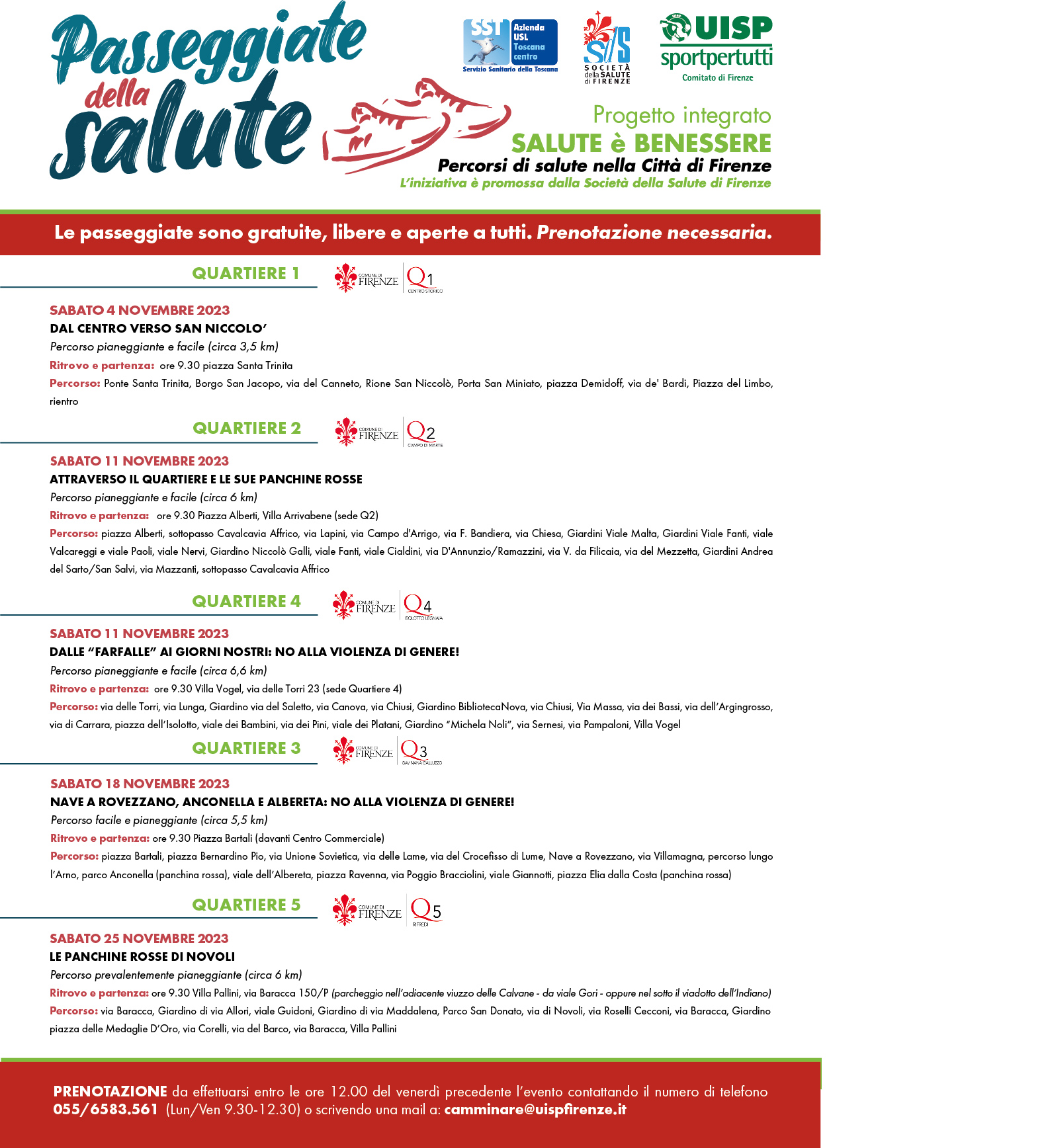 Proseguono a Novembre 2023 le passeggiate gratuite organizzate dalla UISP Firenze nei Quartieri Fiorentini, con cinque nuovi appuntamenti nei quattro sabati del mese; per partecipare è obbligatoria la prenotazione, da effettuare telefonicamente al numero 0556583561 o tramite mail all'indirizzo camminare@uispfirenze.it.