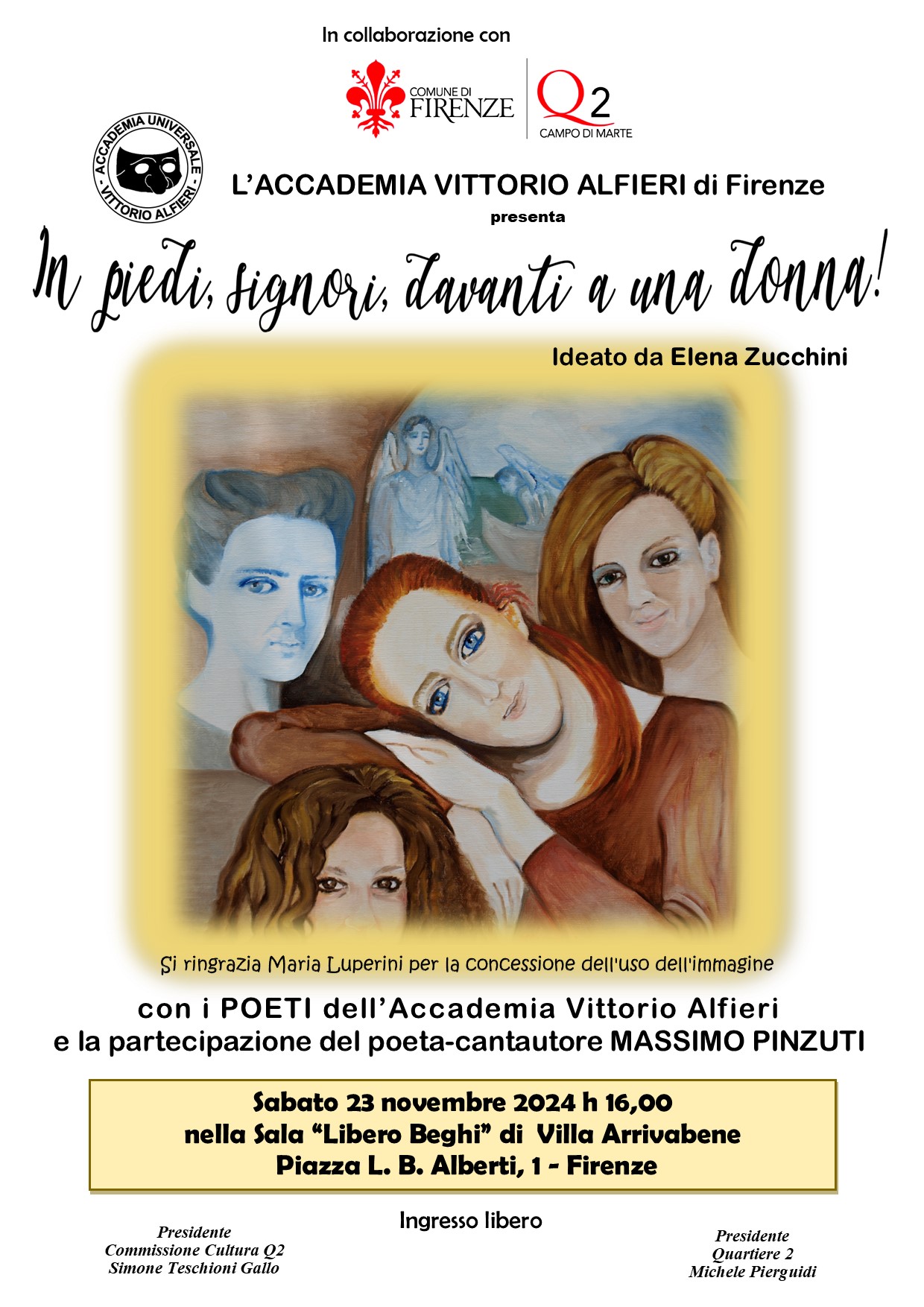 Sabato 23 Novembre alle ore 16.00, nella Sala Libero Beghi in Villa Arrivabene, si terrà l'evento "In piedi, signori, davanti a una donna!", a cura dell'Accademia Vittorio Alfieri con la collaborazione del Quartiere 2; all'evento, ideato da Elena Zucchini, parteciperanno i poeti dell'Accademia ed il poeta-cantautore Massimo Pinzuti.