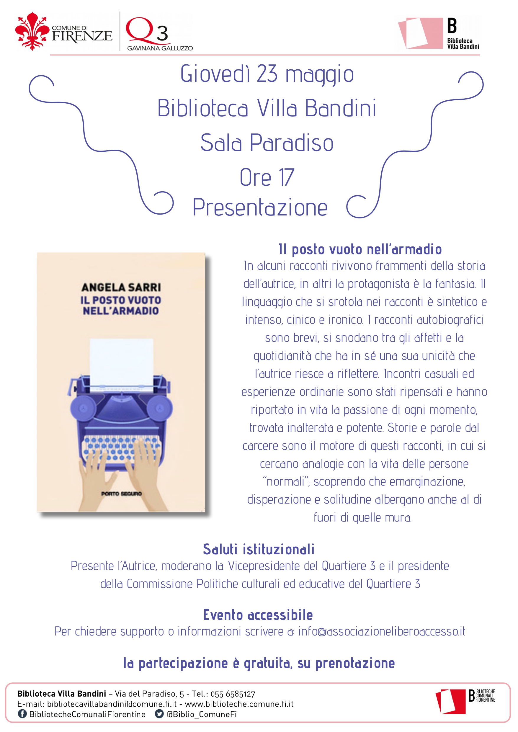 Giovedì 23/05/2024 alle ore 17:00 presso la biblioteca Villa Bandini (via del Paradiso, 5) si terrà la presentazione del libro di Angela Sarri dal titolo "Il posto vuoto nell'armadio".