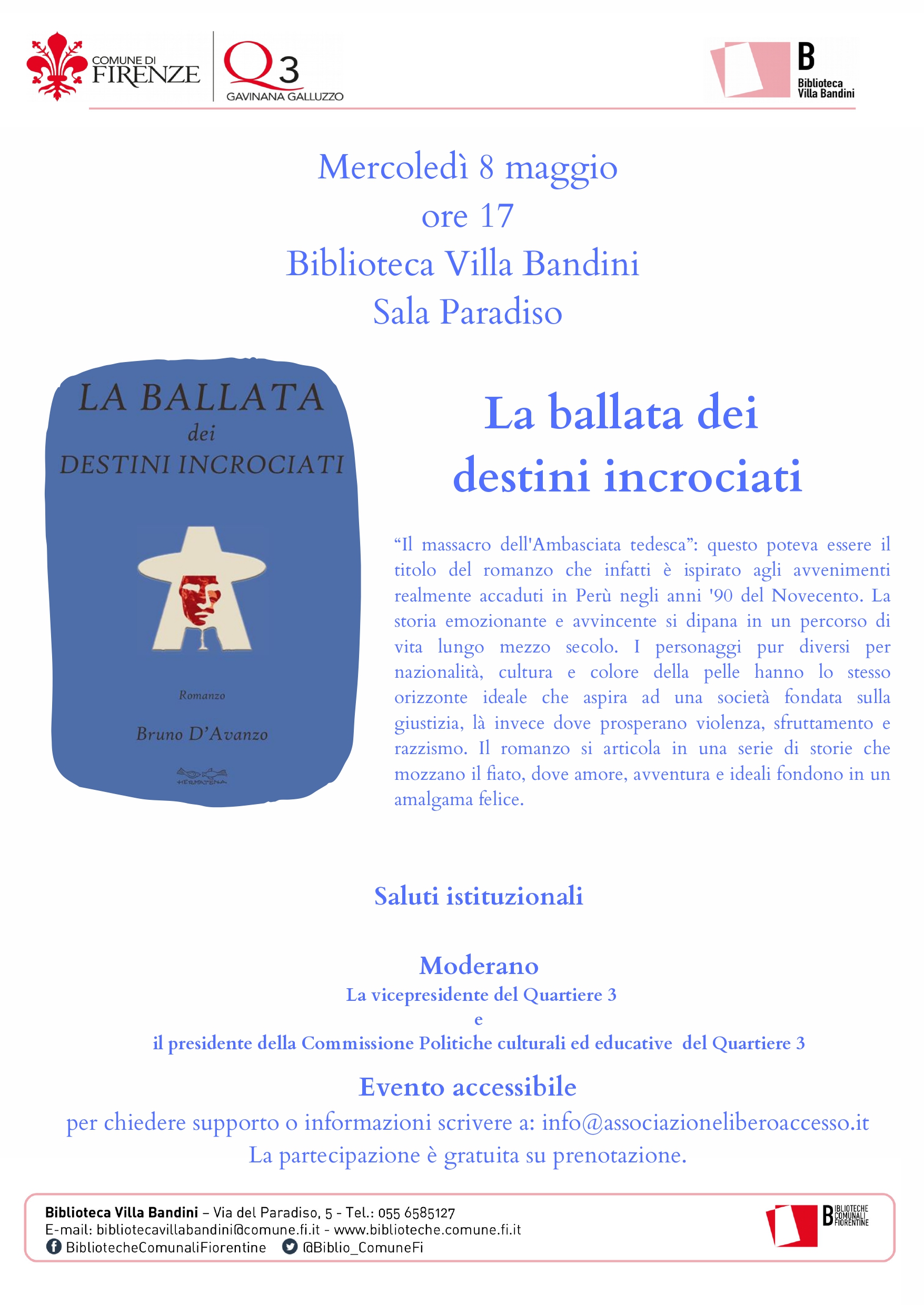 Mercoledì 08/05/2024 alle ore 17:00 presso la biblioteca Villa Bandini (via del Paradiso, 5) si terrà la presentazione del libro di bruno Davanzo "La ballata dei destini incrociati": il massacro dell'Ambasciata tedesca... questo poteva essere il titolo del romanzo che infatti è ispirato agli avvenimenti realmente accaduti in Perù negli anni '90 del Novecento. La storia emozionante e avvincente si dipana in un percorso di vita lungo mezzo secolo. I personaggi pur diversi per nazionalità, cultura e colore della pelle hanno lo stesso orizzonte ideale che aspira ad una società fondata sulla giustizia, là invece dove prosperano violenza, sfruttamento e razzismo. Il romanzo si articola in una serie di storie che mozzano il fiato, dove amore, avventura e ideali fondono in un'amalgama felice.