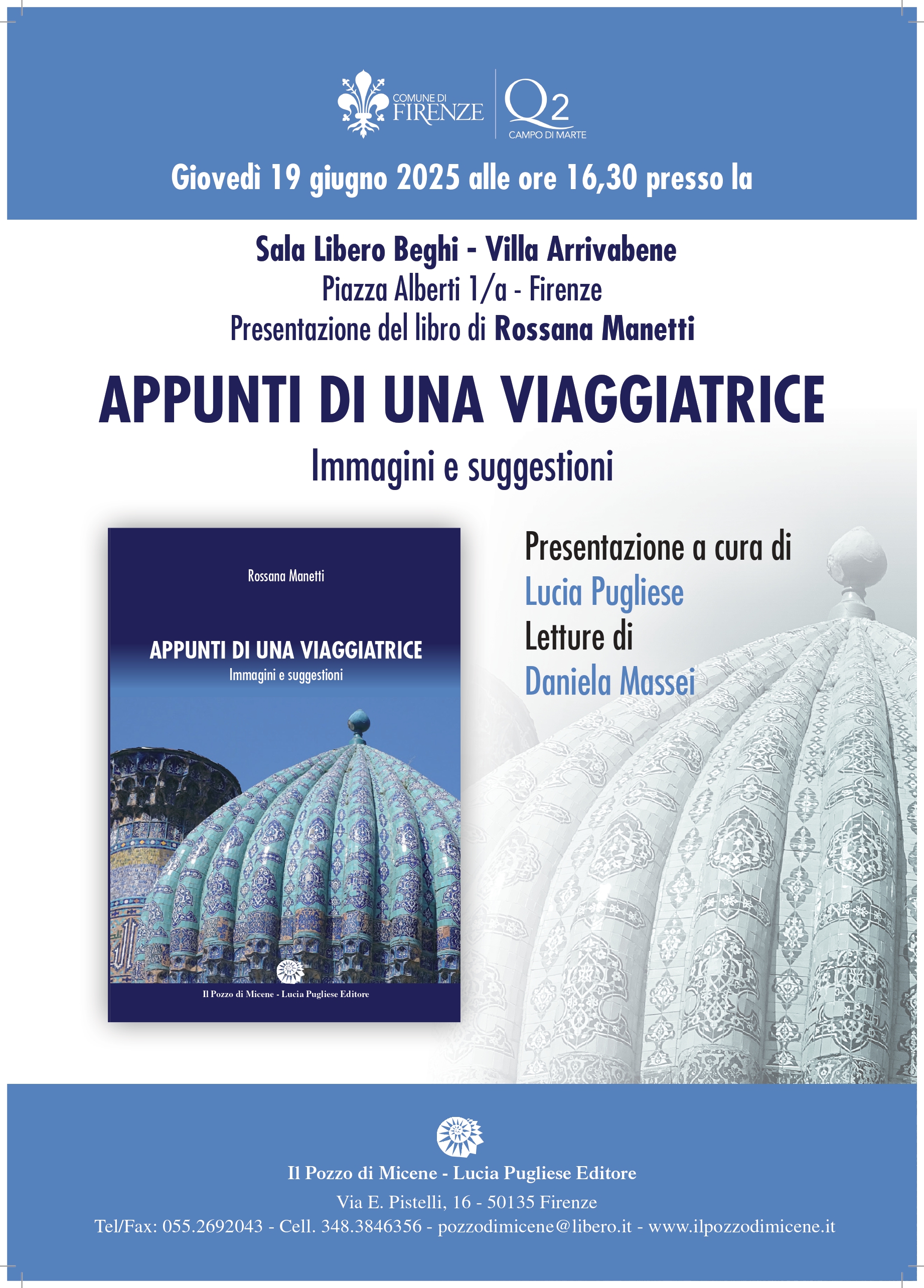 Giovedì 19 Giugno alle ore 16.30, nella Sala Libero Beghi in Villa Arrivabene, si terrà la presentazione del libro "Appunti di una viaggiatrice - Imamgini e suggestioni" di Rossano Manetti; la presentazione, a cura dell'editore Lucia Pugliese, vedrà le letture di Daniela Massei.