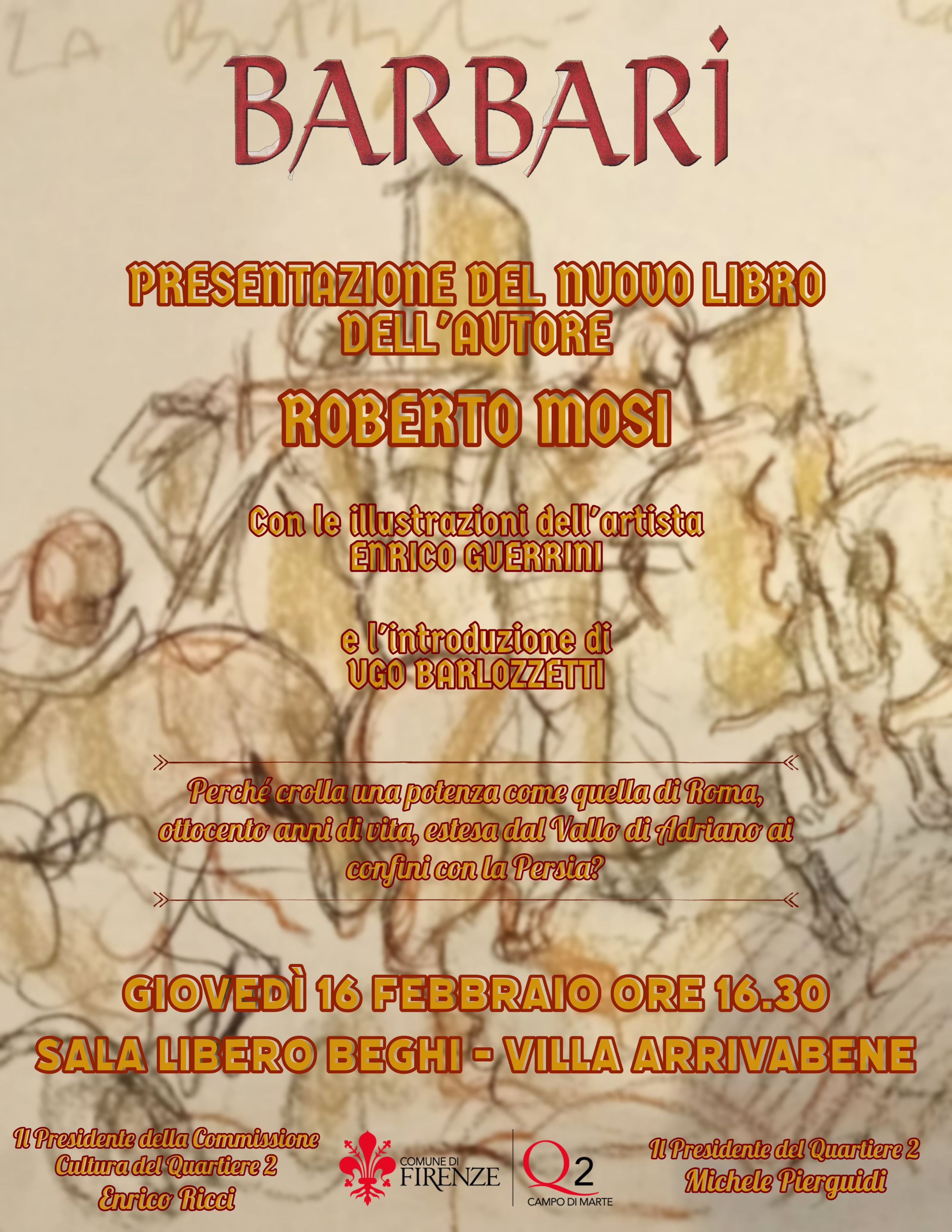 Giovedì 16 Febbraio alle ore 16.30, nella Sala Libero Beghi in Villa Arrivabene, si terrà la presentazione del libro "Barbari" a cura dell'autore Roberto Mosi e con le illustrazioni dell'artista Enrico Guerrini; l'evento vedrà l'introduzione di Ugo Barlozzetti, dell'Associazione Amici del Museo Stibber, a cui seguirà la lettura di alcuni estratti del libro da parte dell'autore.